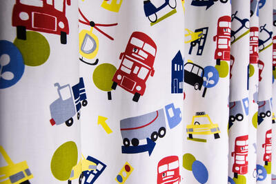 Het gordijn Traffic brengt een vrolijke verkeerswereld tot leven. Het patroon bestaat uit allerlei herkenbare voertuigen zoals vrachtwagens, taxi’s, dubbeldekkers en helikopters. Tussen de voertuigen zie je pijlen, verkeerslichten, bomen en kleine huizen. Alles is losjes over de stof verdeeld, waardoor het lijkt alsof het verkeer in alle richtingen rijdt. Dit maakt het gordijn levendig en leuk om naar te kijken, perfect voor een kinderkamer of speelruimte.