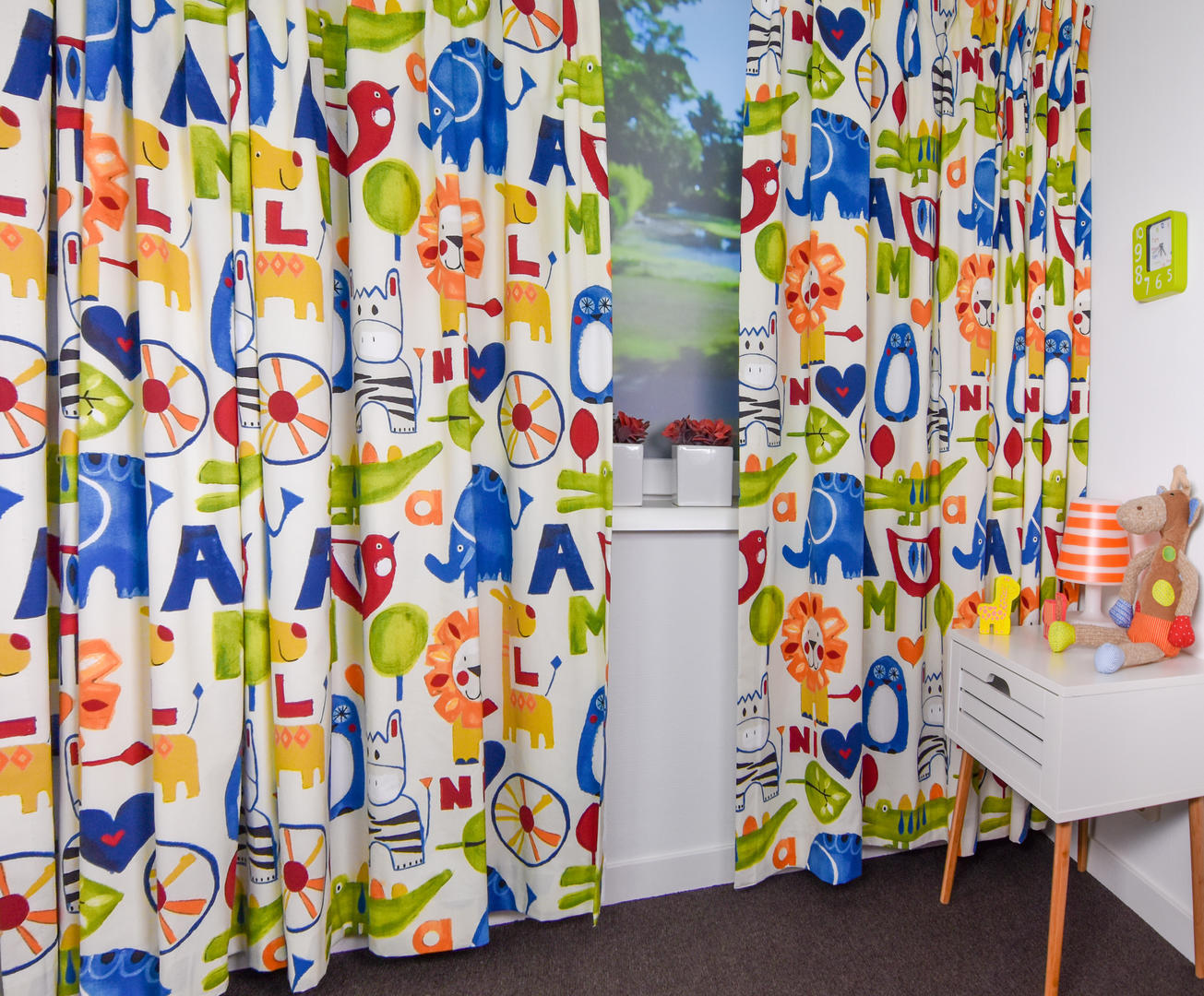Savannen is een levendig kindergordijn waarin een speels dierenrijk samenkomt op een rustige, natuurlijke ondergrond. Over de stof lopen vrolijke leeuwen met volle manen, nieuwsgierige giraffen, een gestreepte zebra, een vriendelijke olifant en een lange krokodil, afgewisseld met grafische bladeren, wieltjes en speelse letters. Het patroon heeft een handgeschilderde uitstraling waarbij de vormen bewust iets ongelijk en zacht zijn gehouden, wat het geheel een warme en toegankelijke sfeer geeft die perfect past in een kinderkamer.