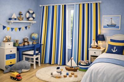 De Blue Mix combineert lichtblauw, marine met groen en zachte roomtinten en frisse gele accenten. Deze samenstelling geeft een rustige, frisse uitstraling en past perfect in kinder- en tienerkamers waar licht en helderheid gewenst zijn.