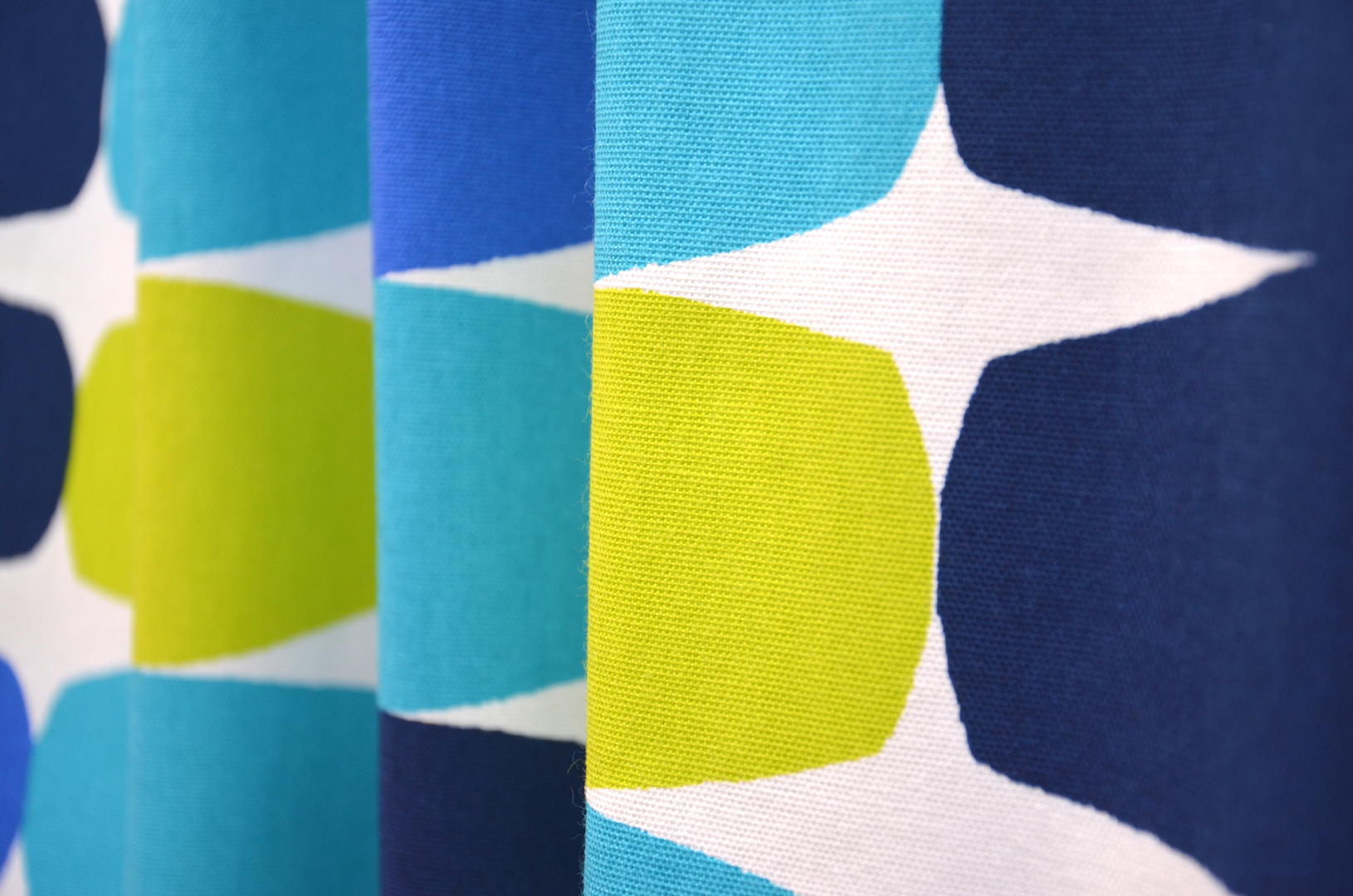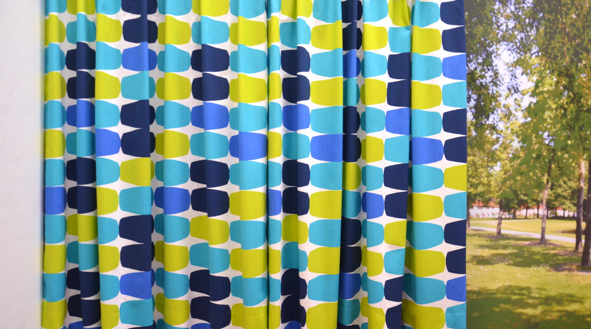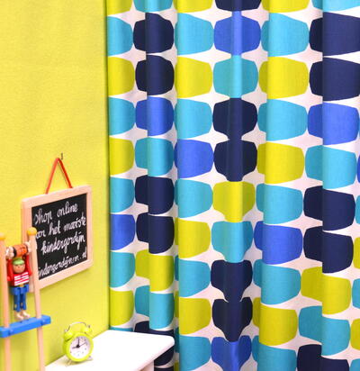 Dit retro gordijn met eenvoudig motief is beschikbaar in vijf verschillende kleurencombinaties.