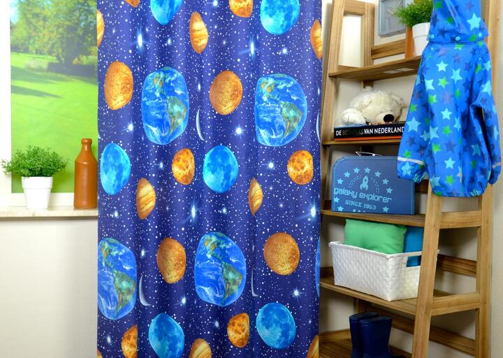 Het HEELAL op je slaapkamer, dat is pas slapen onder een sterrenhemel! Jupiter, Mars en onze planeet Aarde, hier 30 cm groot. De mooie zware bedrukte stof is kamerhoog en kan dus voor dezelfde prijs tot de grond gemaakt worden! De meterprijs is n.l. 280 cm hoog, zo komt ons zonnestelsel extra mooi uit op jouw slaapkamer. Voor extra verduistering kan het gordijn gevoerd worden.