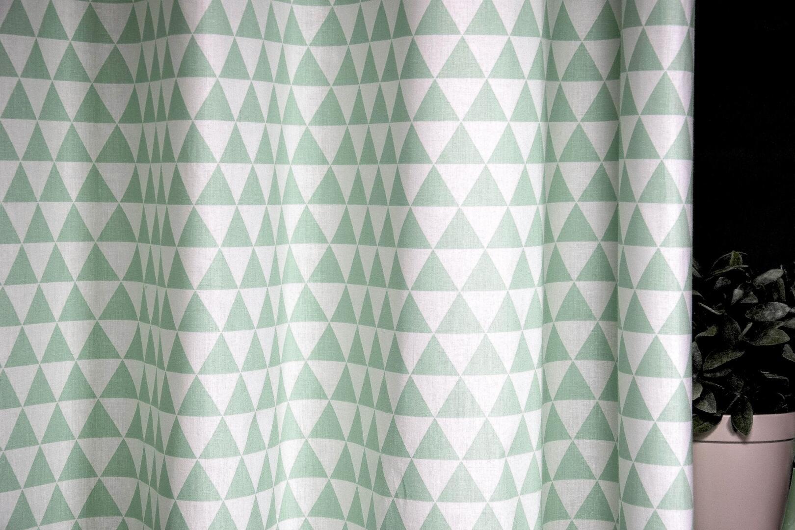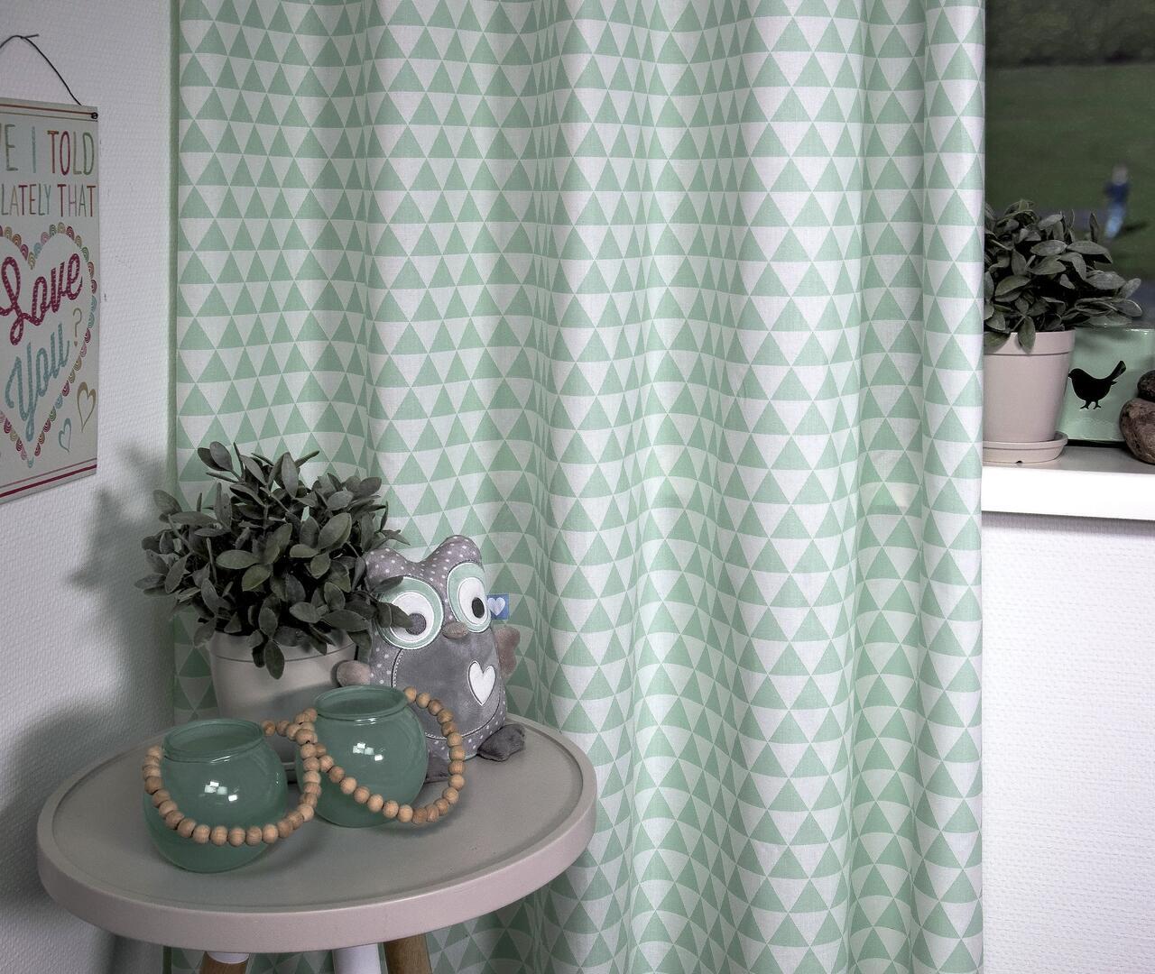 We tonen hier het elegante kindergordijn 'Points'. Dit gordijn heeft duidelijk een grafisch patroon, wat zijn oorsprong vindt in Scandinavisch Design. Hier is gekozen voor mintgrijs, gedrukt op een dichte maar zachte weefstof met een matte textuur. Deze zachte mintgrijze kleur geeft een subtiel effect aan dit gordijn. De kinderkamer kan je voor de rest rustig houden met wittinten en natuurlijke materialen. Een emaille lamp, porseleinen vaasjes en rotan & bamboe combineren super leuk. Dit gordijn is óók uitstekend geschikt voor de hippe (jong) volwassene, het is zo fijn te combineren!  Kies tijdens het bestelproces voor de optie “Voering” en ervaar de voordelen van extra isolatie en verduistering.