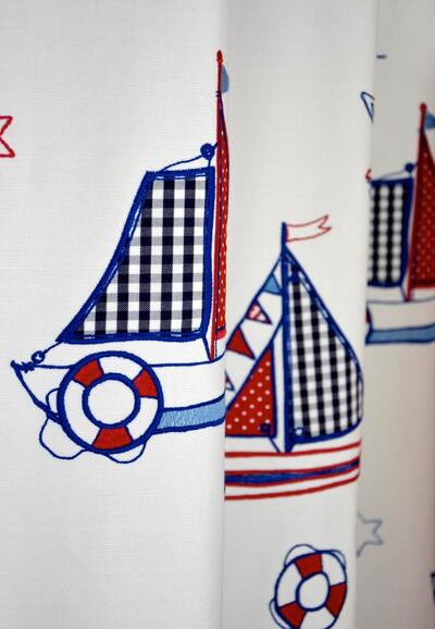 Het gordijn Happy Boy brengt een vrolijk maritiem thema in de kinderkamer met een patroon vol zeilboten, reddingsboeien, sterretjes en kleine vlaggetjes die speels over de stof zijn verdeeld. Op de foto’s zie je hoe elk bootje niet alleen is geborduurd, maar ook is opgebouwd uit echte, ingenaaide printstofjes: ruitjes, stippen en fijne weefsels vormen samen de zeilen, terwijl de rompen en details met een stevige borduursteek zijn omlijnd. Dat geeft een voelbare diepte en een ambachtelijke uitstraling die je direct ziet én voelt wanneer je de stof in handen hebt.