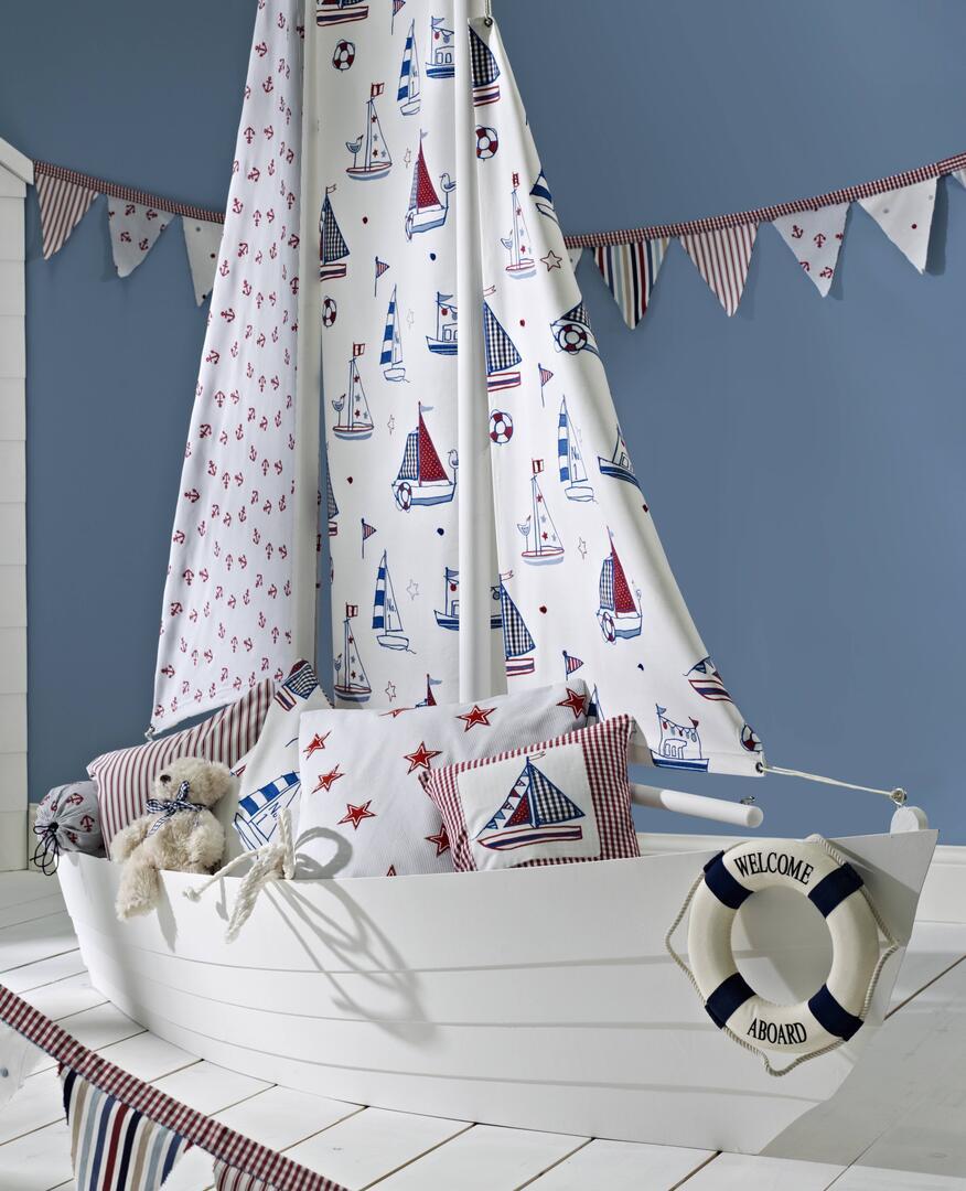 De ondergrond is een mat geweven katoen met een lichte, bijna linnenachtige structuur die het patroon mooi draagt zonder te glanzen. In de eerste kleuruitvoering komt het nautische gevoel naar voren met frisse blauwtinten, wit en zachte zandkleuren, aangevuld met subtiele accenten in lichtgrijs. De tweede kleuruitvoering voegt daar rood aan toe, zichtbaar in de stippen op de zeilen, de kleine vlaggetjes en de details rond de boten, wat het geheel wat levendiger en stoerder maakt. Beide varianten blijven rustig genoeg voor een slaapkamer, maar hebben door het borduurwerk en de ingelegde stofjes een rijk en tastbaar karakter.
