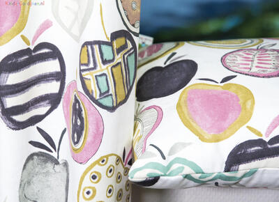 Een kindergordijn met appeltjesprint! De frisse kleuren ademen een warme sfeer in de kinderkamer. De appelprint is gedrukt op de voorzijde, ze zijn 10 cm in doorsnede. Het gordijn kan prima verduisterend worden geconfectioneerd, deze optie kunt u aan-vinken tijdens het bestelproces.