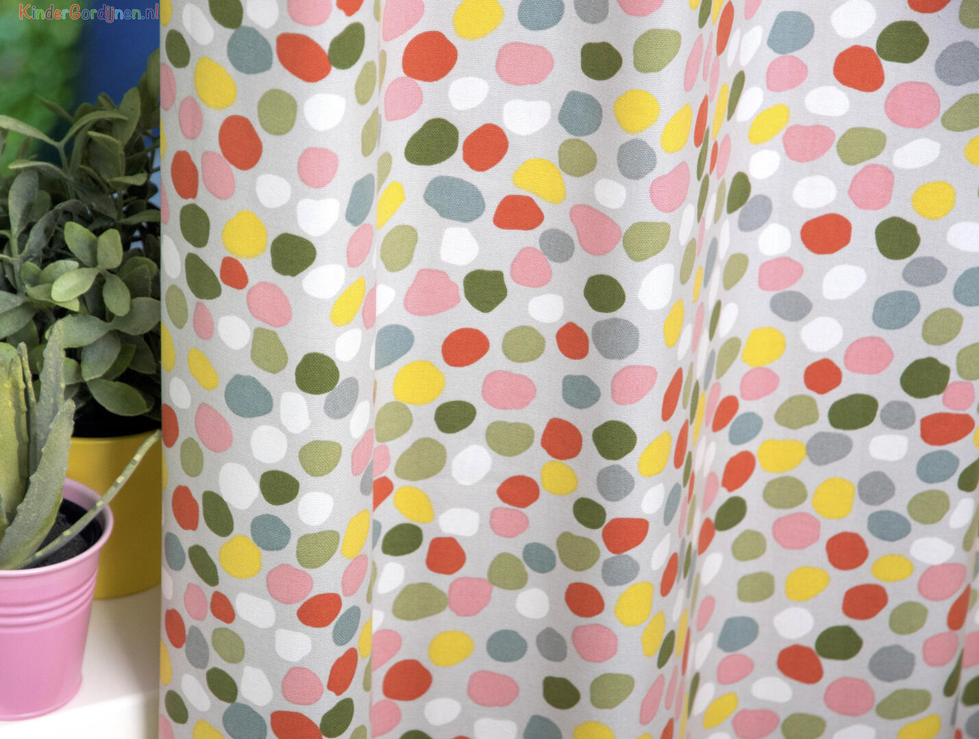 STIPPEN zijn HIP! En dit gordijn heeft er heel wat in héérlijke heldere, frisse kleuren. De stip is 3 cm in doorsnede en heeft het effect alsof zij met de kwast aangebracht zijn. Dat geeft een speels en kleurrijk effect. De ondergrond is een warm witte, dicht geweven stof, die desgewenst verduisterend gevoerd kan worden. Je kunt dit gordijn heel leuk combineren met een pittige muurverfkleur.
