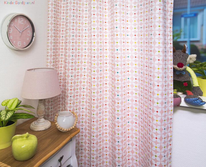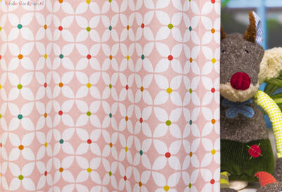 Het Zapp-kindergordijn is gemaakt van hoogwaardige stof met een tijdloos Scandinavisch patroon. Op de opvallende stof zijn kleine grafische bloemen te zien, met witte blaadjes met kroontjes in verschillende passende kleuren. Door het regelmatig herhalende patroon krijgt de stof een moderne en speelse uitstraling die perfect is voor de kamer van je kind.