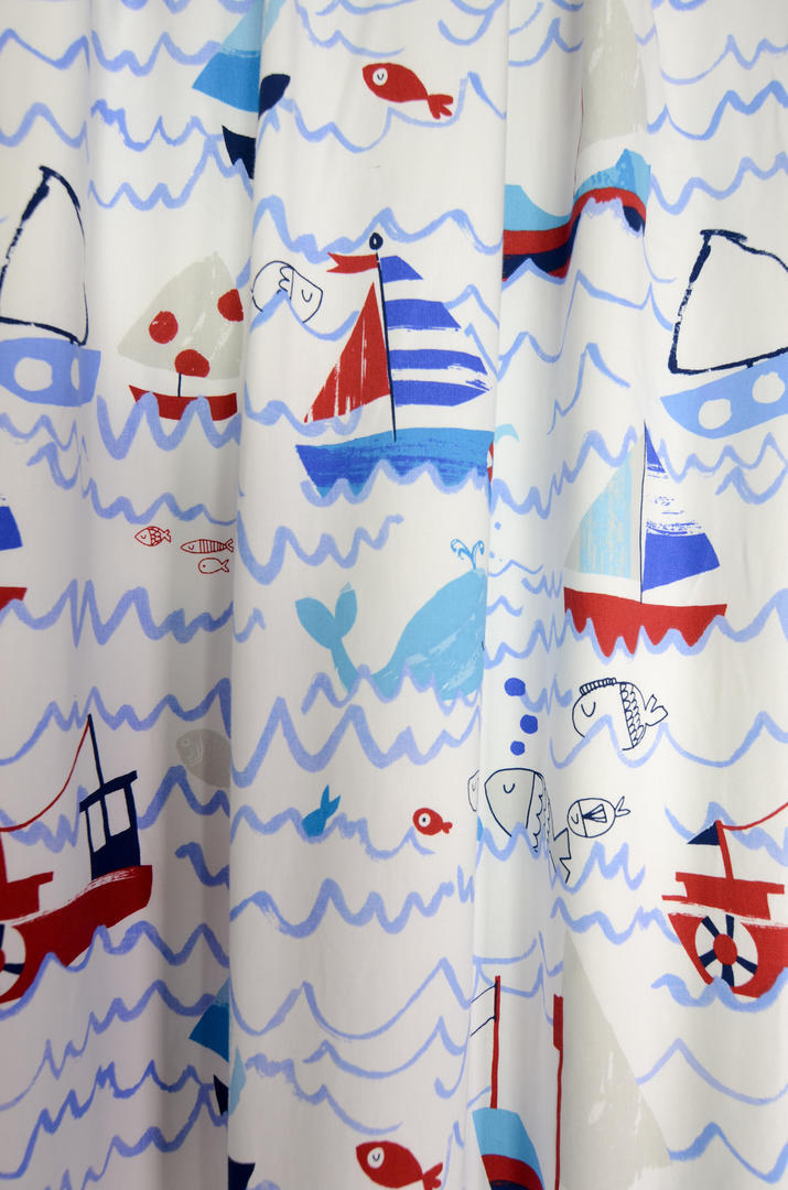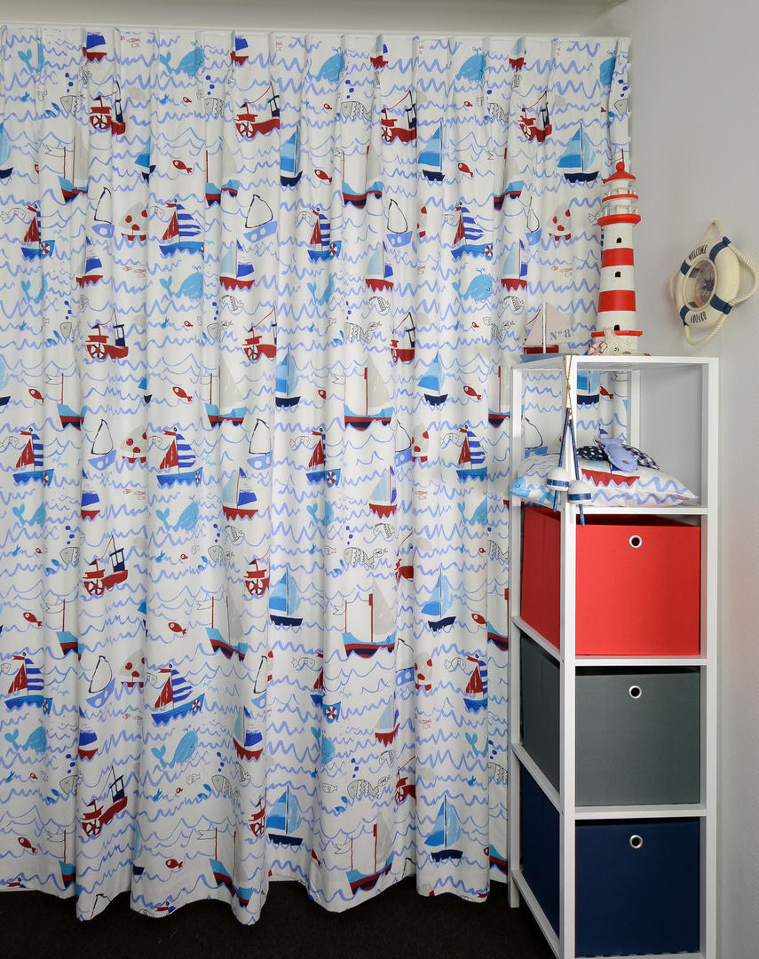 Een fraai maritiem gordijn, leverbaar in 2 kleuren. De lekker robuust geweven stof is warm wit van kleur en aan de voorzijde bedrukt met grafisch vormgegeven bootjes en visjes. De blauwe variant heeft diep steenrood als accentkleur. De aqua blauwe variant is lichter en fris van kleur en heeft lindegroen als accentkleur. De bootjes zijn +/- 15 cm groot. Het is natuurlijk super leuk om dit thema met accessoires uit te breiden en evt. een accent blauwe of groene wand. De kwalitatief hoogwaardige stof valt soepel en kan desgewenst nog gevoerd worden. Zie jij de nieuwe kamer al voor je?