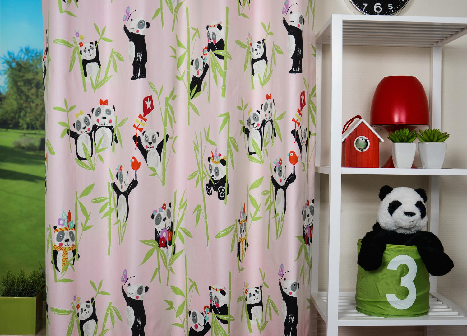 AhhhÂ… om te smelten, wat een schattige reuzenpanda’s! In het wild leven pandaberen alleen in Azië. China om precies te zijn en daar eten zij de hele dag door verse bamboeblaadjes. Ze hebben een dikke vacht omdat de winter in de Chinese bergen erg koud is. Gelukkig heb jij vast een héérlijk warme slaapkamer voor deze berenfamilie. De panda’s zijn zo’n 14 cm groot. De gordijnstof is leverbaar in 3 frisse kleuren en kan naar wens gevoerd worden.