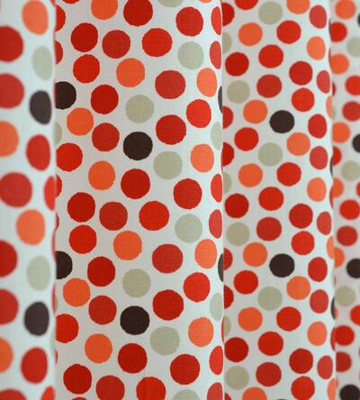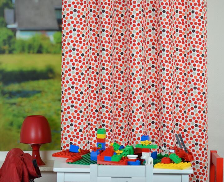 Stoere stippenstof! Dit gordijn past in iedere kinderkamer: stippen zijn speels, vrolijk & sprankelend. Het patroon is gedrukt op mooie dicht geweven, matte katoen. De stof is leverbaar in 3 verschillende kleurpaletten, daardoor geschikt voor zowel de meisjes- als jongenskamer. De kaneelkleurige variant is natuurlijk heel leuk in een naturel style slaapkamer met riet, rotan, zeegras en sloophout. Zie je het plaatje al voor je? Voor verduistering even laten voeren.