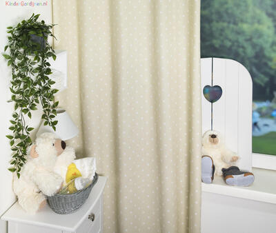 Een STIP blijft altijd HIP! Een stippelgordijn kan zowel voor de kinder- als babykamer. Ideaal zo’n rustig patroontje wat uitstekend met andere vormen & thema’s combineert. Je kan met behang of beddengoed alle kanten op. De stip is 1 cm in doorsnede en het gordijn leverbaar in drie kleuren: stijlvol roze, tijdloos zand-grijs en fraai Scandinavisch blauw. Dit is op de voorzijde aangebracht, de achterzijde is neutraal wit. De matte stof is mooi dicht geweven, met een lichte structuur wat een vlotte uitstraling geeft. Overduidelijk een zichtbaar goede kwaliteit. Het gestipte gordijn kan verduisterend gevoerd worden, wanneer je graag donker slaapt. Voor welke kleur ga jij?