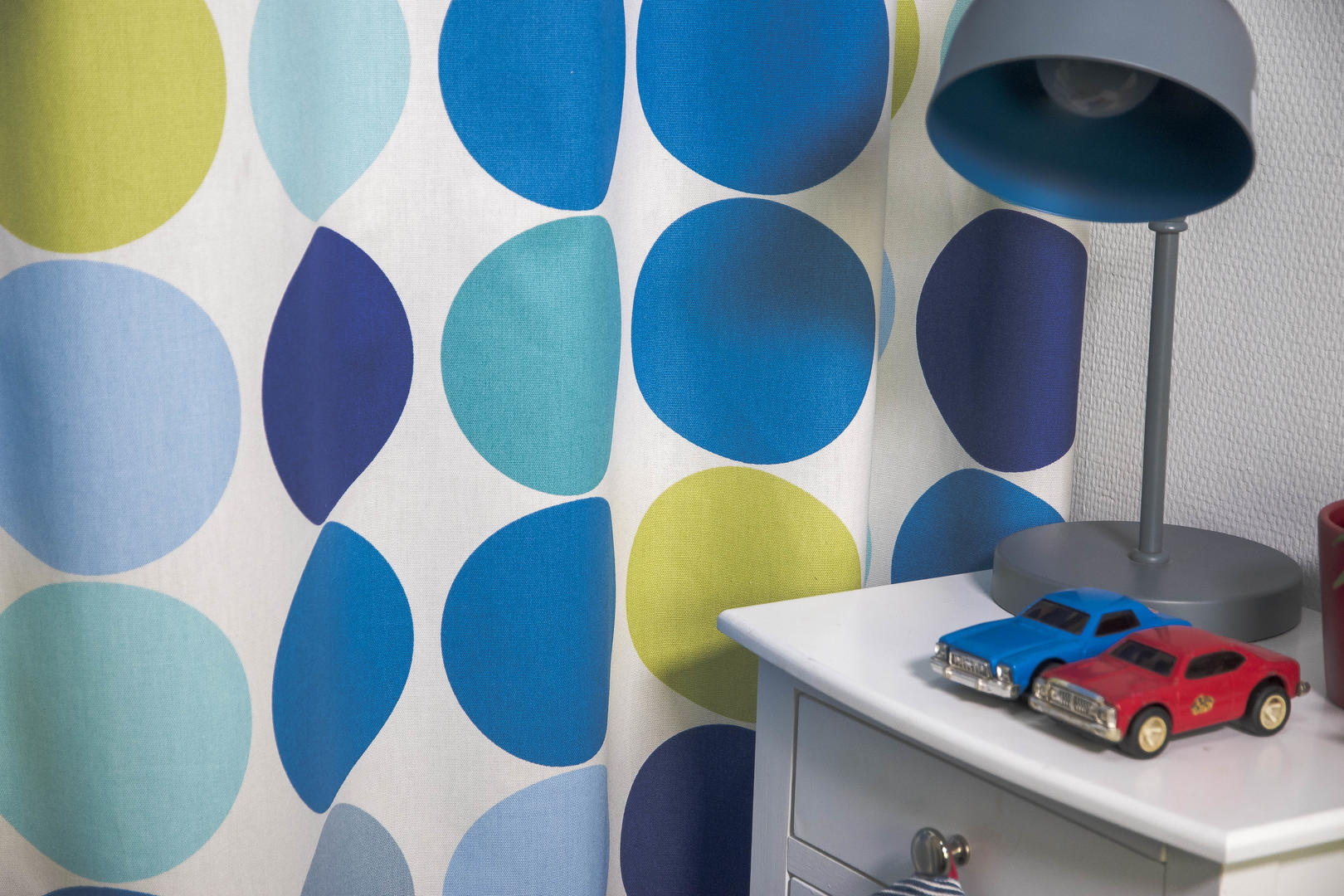 Met het kindergordijn "Spot On" kun je de kinderkamer in een handomdraai omtoveren tot een levendige en gezellige omgeving! Dit vrolijke gordijn is versierd met verschillende rijk gekleurde grote "spots" die de ruimte opfleuren. De grote stippen, met een diameter van 15 cm, zijn in een vast patroon gedrukt op een witte ondergrond. Het resultaat is een speels en vrolijk gordijn waar je blij van wordt! De gordijnstof is gemaakt van 100% katoen, waardoor het zacht en duurzaam is.
