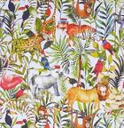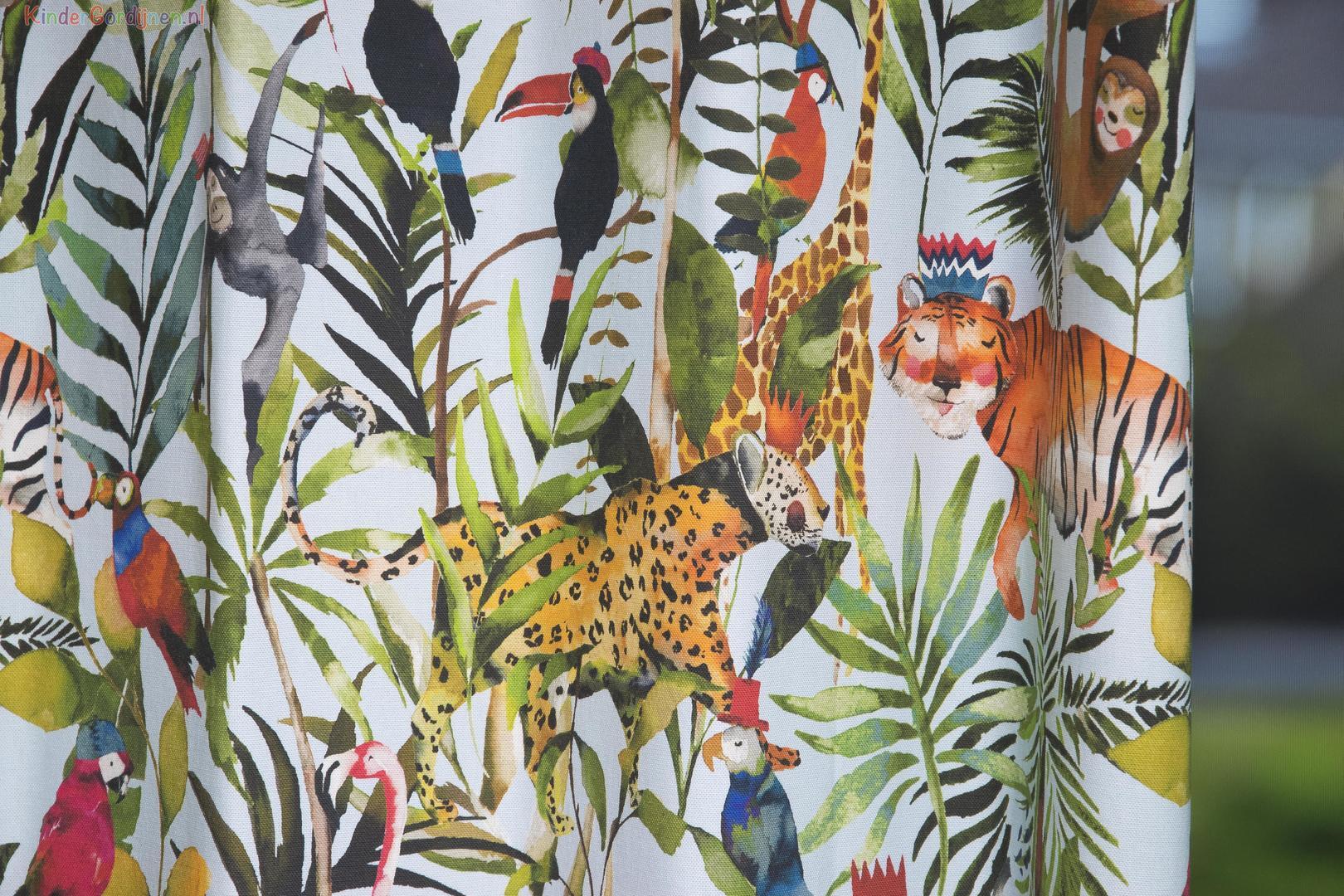 Een plaatje dit kindergordijn! De kleuropbouw is heel eigentijds, maar kijk eens goed naar de fraaie schilderachtige afbeeldingen. Het sfeertje ademt een stukje fijne nostalgie. De stof is dicht geweven en mat en aan de voorzijde bedrukt met deze aquarelachtig geschilderde safaridieren. Door het fraaie groene gebladerte op de achtergrond ontstaat zelfs de natural living sfeer. Palm, zeegras en riet & rotan passen hier perfect bij! Het oerwoud gordijn is leverbaar in 2 verschillende ondergrondkleuren: warmwit en fris aqua blauw. Goed te combineren met lichte wanden, maar ook een zachte, afgezwakte tint uit het gordijn maakt het geheel perfect in stijl!