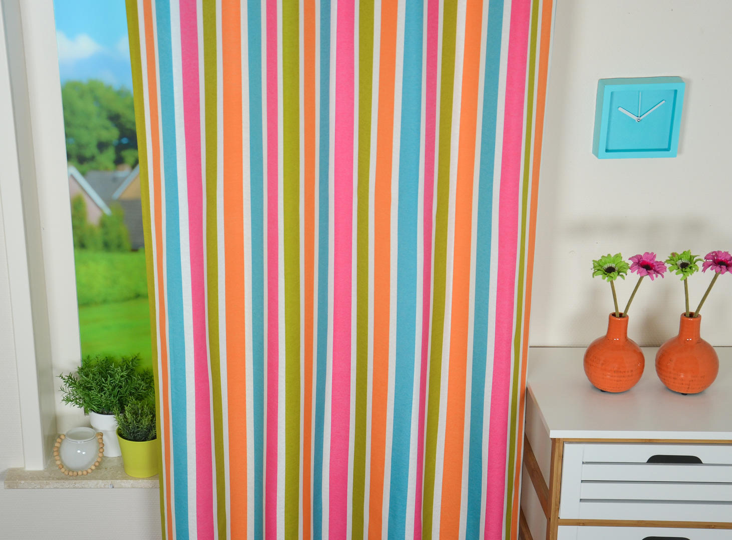 Strepen zijn STYLISH! Makkelijk te combineren met andere patronen en afbeeldingen. Ook geeft een streep een hoogte effect, waardoor de kamer wat ruimtelijker lijkt. Dit gordijn is leverbaar in 5 verschillende kleurcombinaties en allemaal voorradig! Snelle levering is daardoor gegarandeerd. Het patroon is gedrukt op licht geribde, matte stof, wat een vlotte uitstraling geeft. De strepen zijn 5 cm breed en voor kleurbehoud of een donker makend effect graag even voeren.