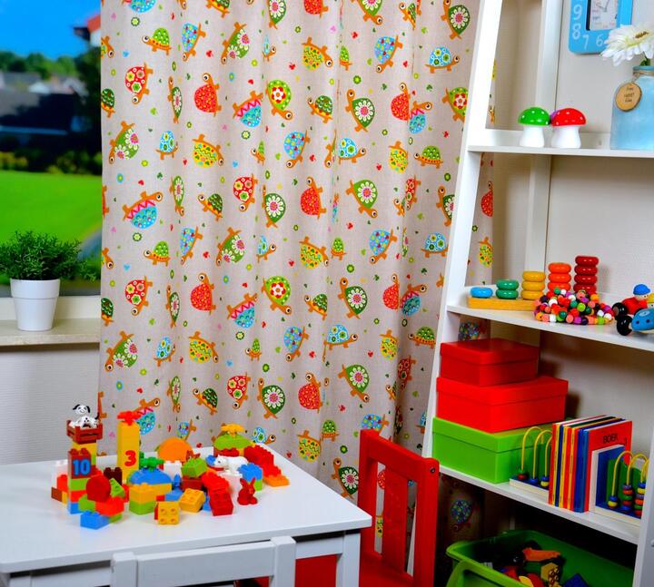 Dit decoratieve gordijn moet je eigenlijk in het écht zien! De vrolijk en kleurrijke schildpadjes zijn gedrukt op licht geribbelde stof. De stof is leverbaar in 2 verschillende warme ondergrondkleuren: linnen of nostalgisch bruin. Dat geeft extra gezelligheid aan de slaapkamer. De schildpadjes zijn 7 x 10 cm en kijken allemaal blij jouw kamer in. Riet & rotan past perfect bij dit sfeertje. Desgewenst verduisterend voeren.
