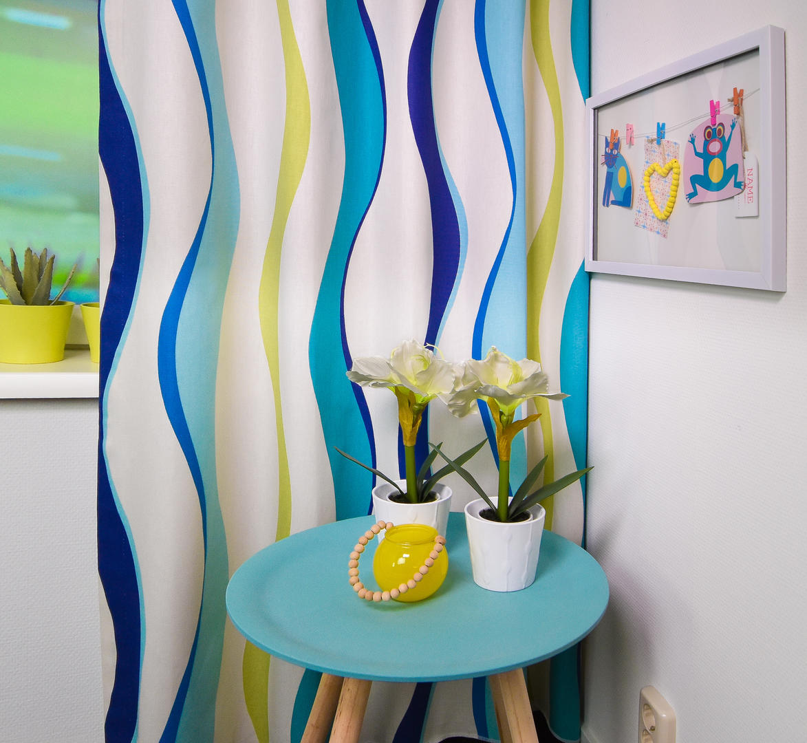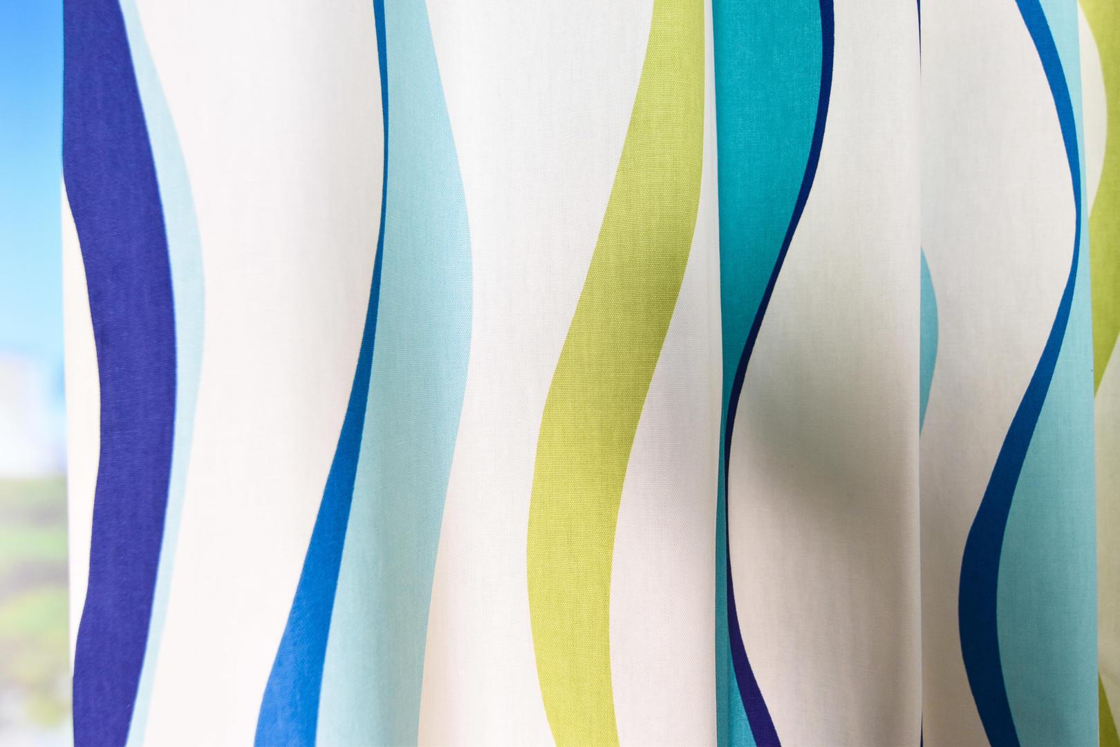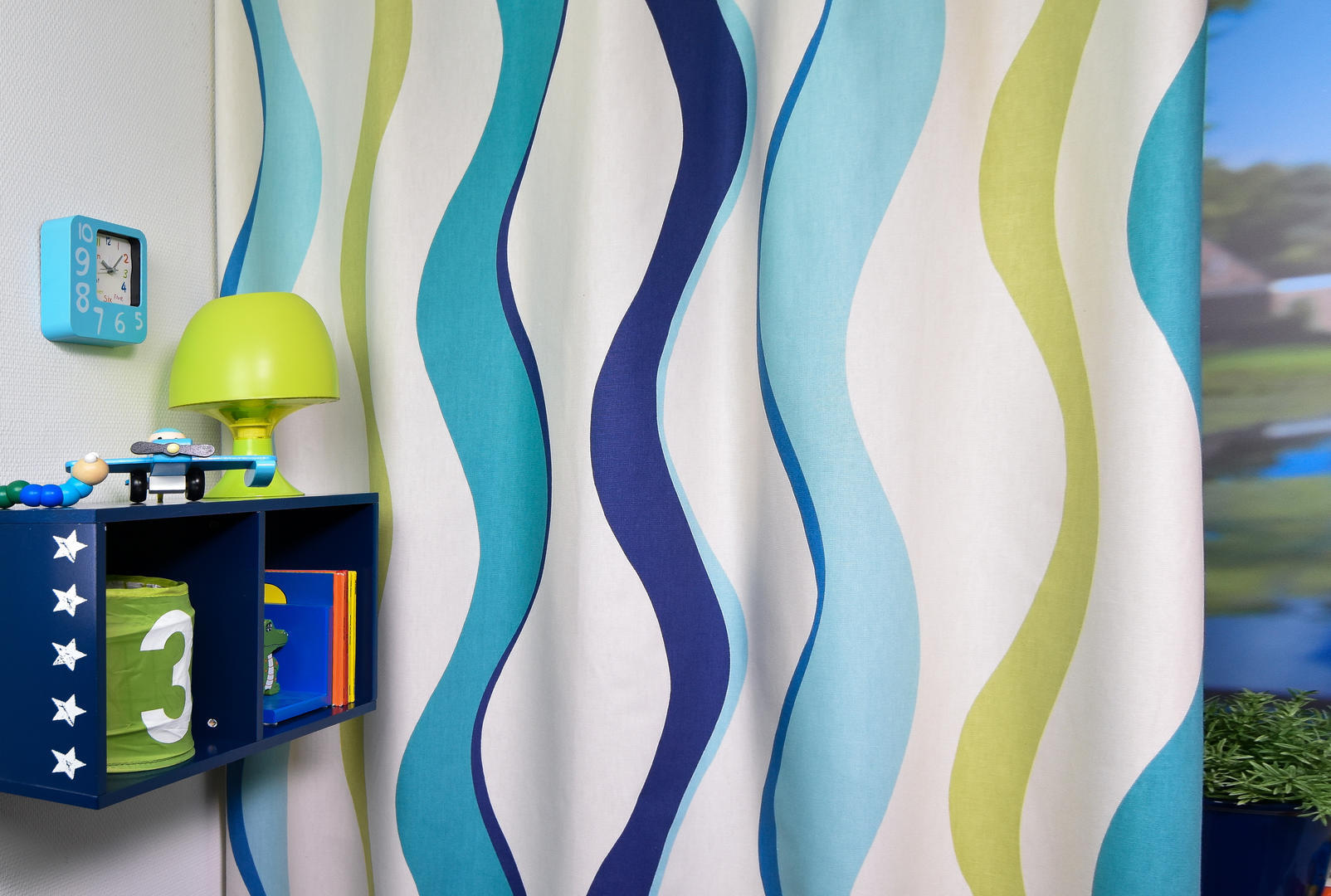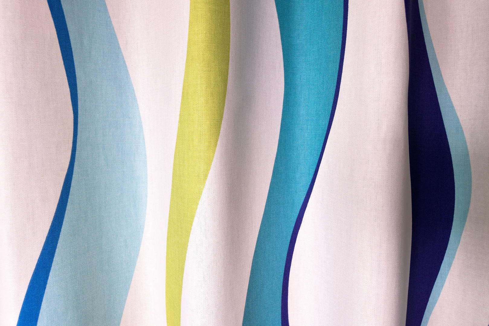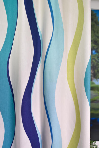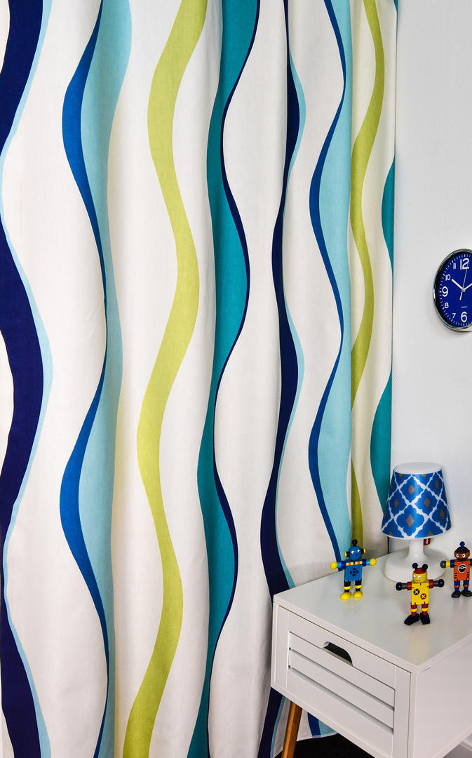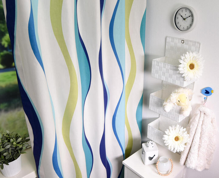 Prachtige golven dansen over dit gordijn! Vandaar de mooie naam ‘Rumba’, maar ook ‘water waves ‘ zou passend zijn. De rustige, herhalende golven vervelen nooit en zijn voor zowel een meisjes- als jongenskamer uitstekend geschikt! De ondergrond is warm witte, matte katoen en fraai dicht geweven van kwaliteit. Het gordijn valt daardoor perfect in de plooi, zelfs wanneer het verduisterend gevoerd is. Deze optie kun je aanvinken in het bestelproces. Door de tijdloze & rustgevende vorm kan je dit gordijn nog met allerlei leuk behang combineren of een gave accentwand met muurverf. Dit gordijn pakt altijd stijlvol uit!
