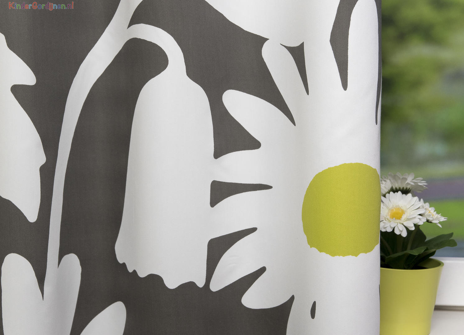 Het kindergordijn Salvi is een prachtige keuze voor de kinderkamer. Op dit gordijn staan grote witte bloemen met een geelgroene kern, geplaatst op een achtergrond in zwart en grijs. Deze opstelling zorgt ervoor dat de bloemen goed tot hun recht komen en een levendig en vrolijk gevoel creëren in de ruimte. Het materiaal dat gebruikt is voor het Salvi kindergordijn bestaat uit 70% polyester en 30% katoen. Dit zorgt ervoor dat het gordijn soepel valt en een mooie uitstraling heeft.