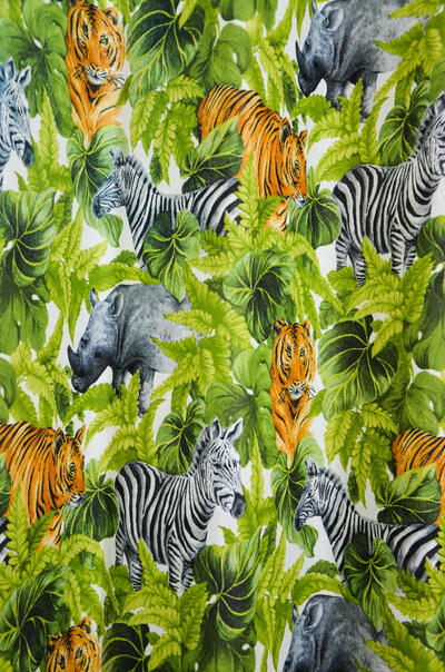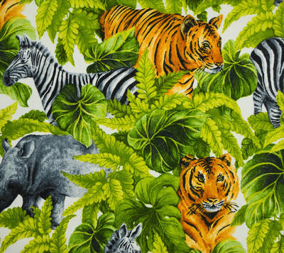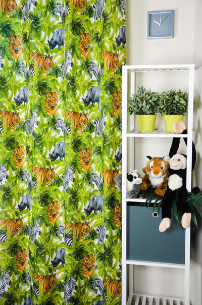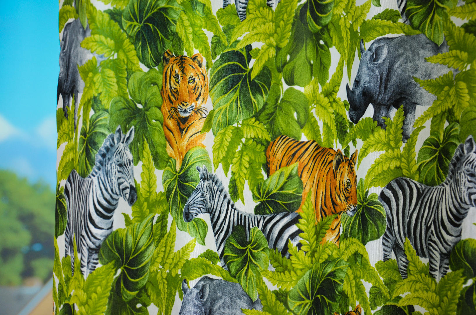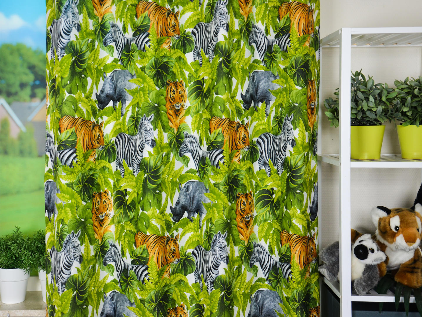 GRRR…. TIJGERGORDIJNEN! En niet alleen tijger, want dierenprints zijn HOT! Zebra en neushoorn laten zich ook zien. Het patroon is gedrukt op matte, ietwat geribde stof. De tijger is 15 cm groot en kijkt uitdagend jouw kamer in. Durf jij het aan? De stof is voorradig, dus snelle levering gegarandeerd! Een extra kussen van deze stof maakt het thema natuurlijk compleet. Voor verduistering even laten voeren.