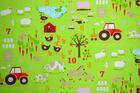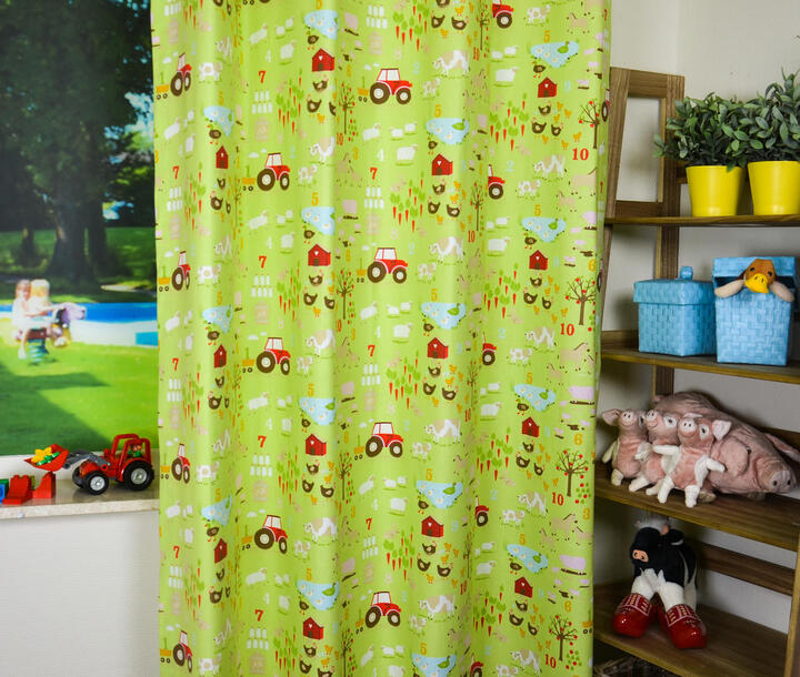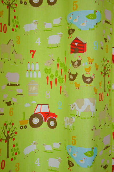 Het BOERDERIJTHEMA doet het altijd goed bij de kleintjes! Dit gordijn heeft een zachtgroene ondergrond of antiek wit. De stof heeft een fijne matte weefstructuur. De kipjes, koetjes, lammetjes, paarden en roze biggetjes staan er állemaal op. En óók nog te tellen, dat is extra leuk! Het aantal staat er subtiel naast gedrukt in kleur. De tractor is 10 x 7 cm groot en samen met het appelboompje in een rode accentkleur. Kortom een gordijn waar heel veel op te zien is! Voor verduistering graag even laten voeren.
