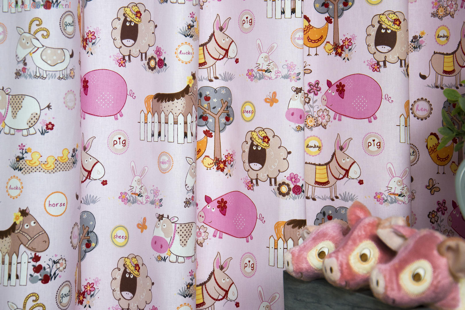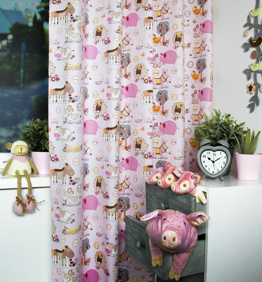 Op zoek naar een vrolijk gordijn voor de babykamer? Zoom dan in en geniet van alle gezellige boerderijdieren! Zo leuk voor de kleine dat er zoveel te zien is, van lieve eendenkuikens tot knabbelend geitje. De stof is leverbaar in 3 verschillende kleur paletten en daardoor geschikt voor de jongens- en meisjes slaapkamer. De kleur en dierenprint is aan de voorzijde gedrukt op de matte, fijn geweven stof. Dit gordijn past perfect bij een helder witte muur of een hele zachte pasteltint. Dan houd je het geheel lieflijk en rustig. Ook een houtlook vloer (laminaat/ PVC) is een perfecte combinatie. Zie jij het droom plaatje al voor je?