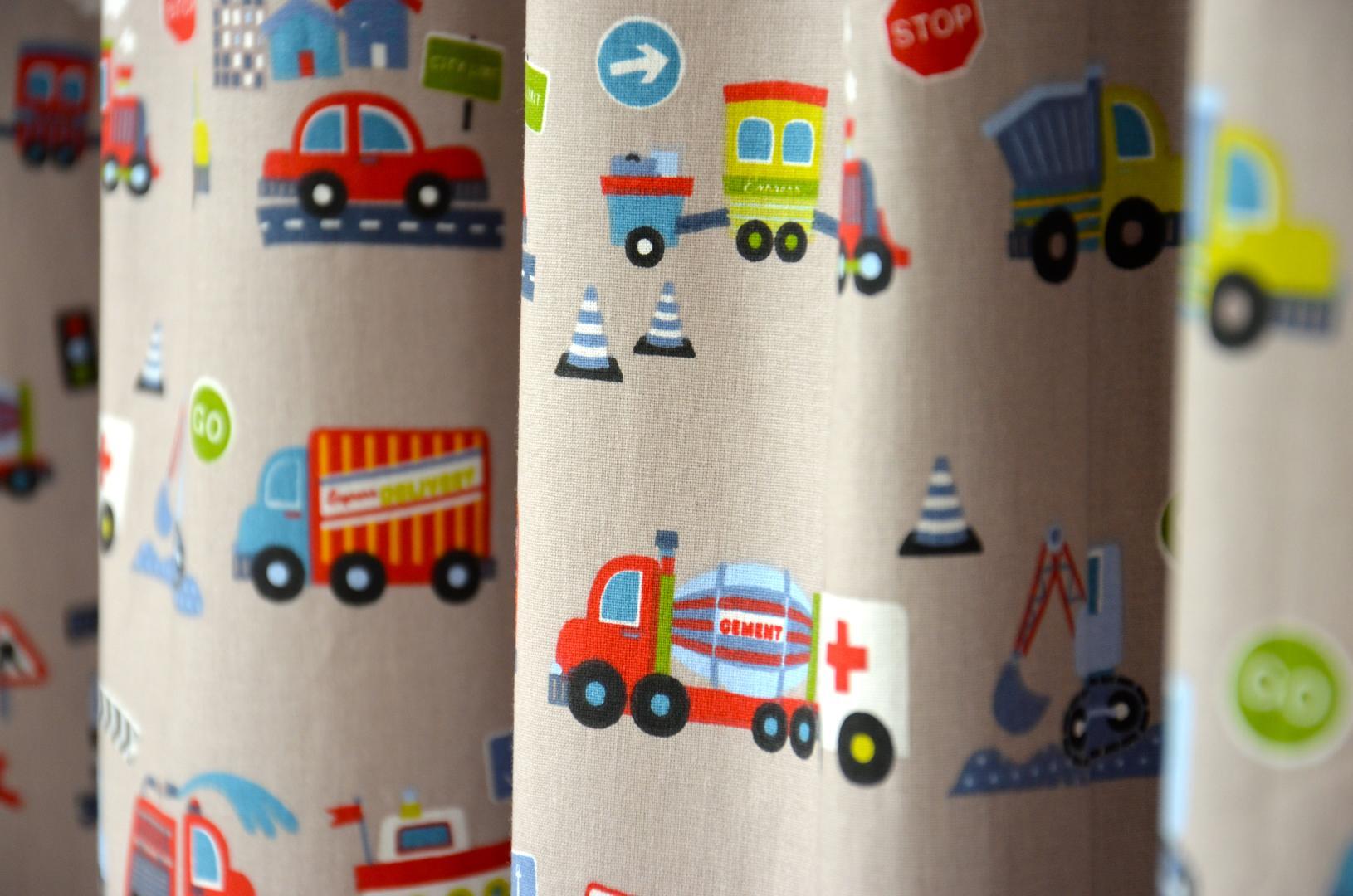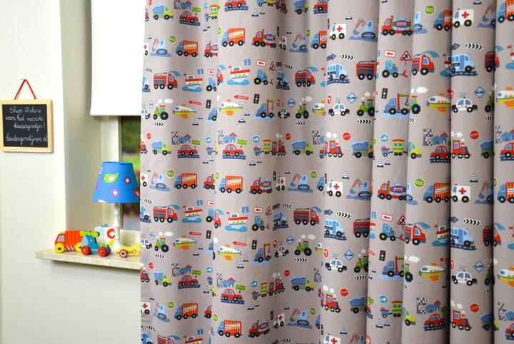 Auto, trein en boot, al reizend word je blij & groot. Héérlijk gordijn voor ondernemende kids! Het extra leuke van dit kindergordijn is dat er zoveel op te zien is. De verschillende auto’s, treinen, bootjes zijn gedrukt op soepelvallende, matte katoen. Deze is glad geweven en leverbaar in 2 verschillende ondergrond kleuren: fris zachtblauw of taupegrijs. Bij de zachtblauwe variant is een lichtgrijs geverfde wand leuk. Bij de taupe grijze ondergrond kleurt een blauwe muur leuker. Dat is ideaal, want zo kan je precies jouw gewenste kleurcombinatie bepalen. Stap gezellig in en maak een fijne reis naar dromenland in jouw favoriete voertuig!