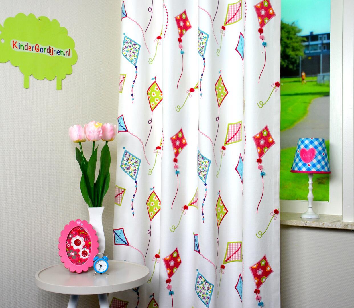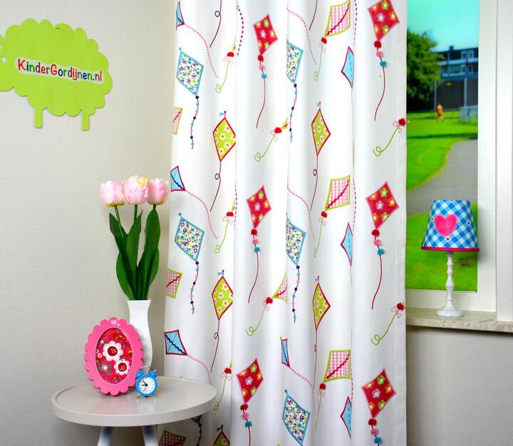 Bijzonder zijn de staarten van de vliegers: deze bestaan uit echte koordjes met kleine kwastjes in kleuren als rood, zacht roze en lichtblauw. Deze kwastjes zijn daadwerkelijk in de stof vastgezet en bewegen licht mee wanneer het gordijn beweegt, wat het geheel een speelse en levendige uitstraling geeft.