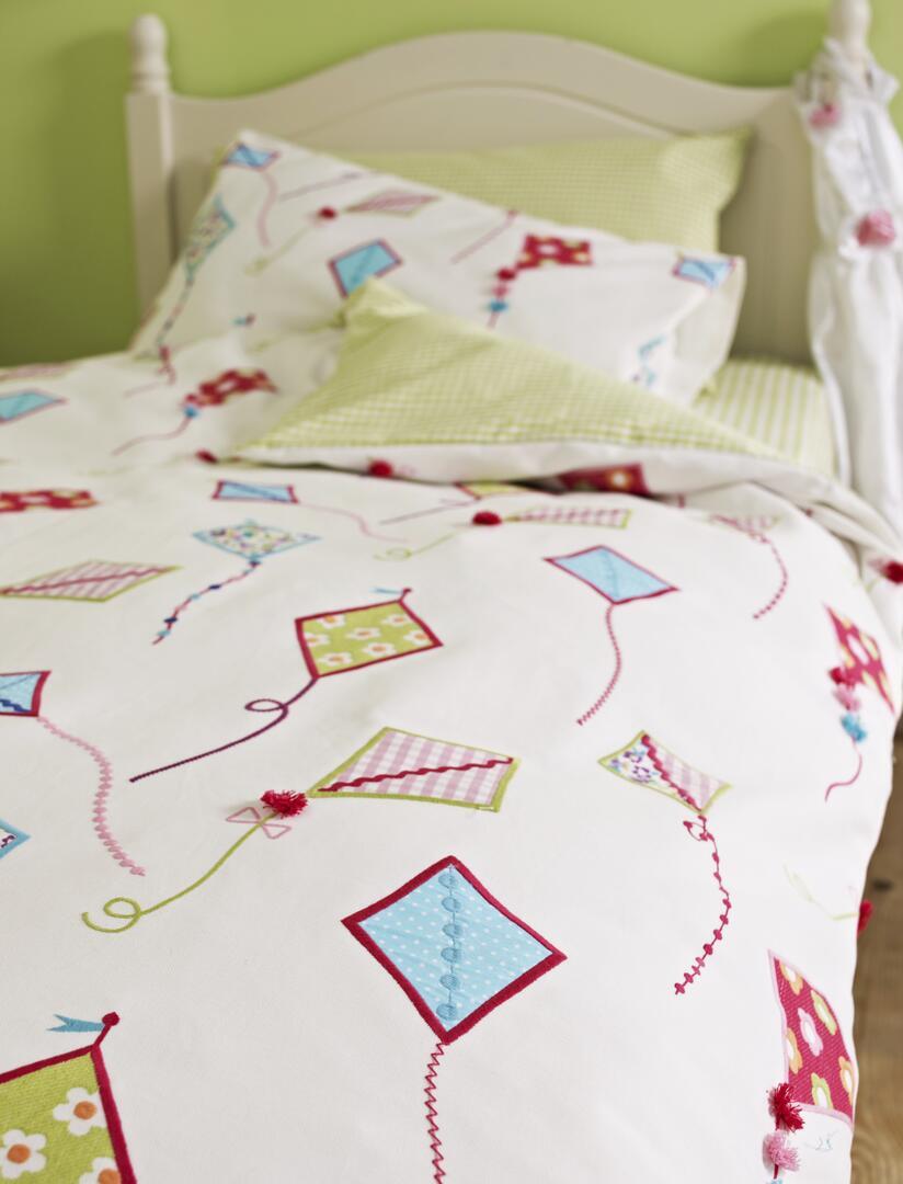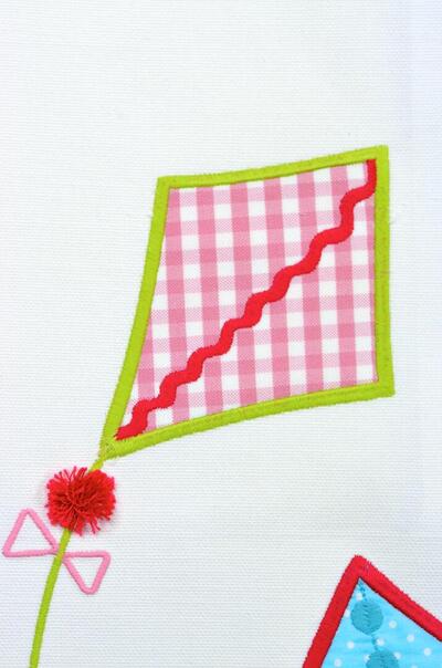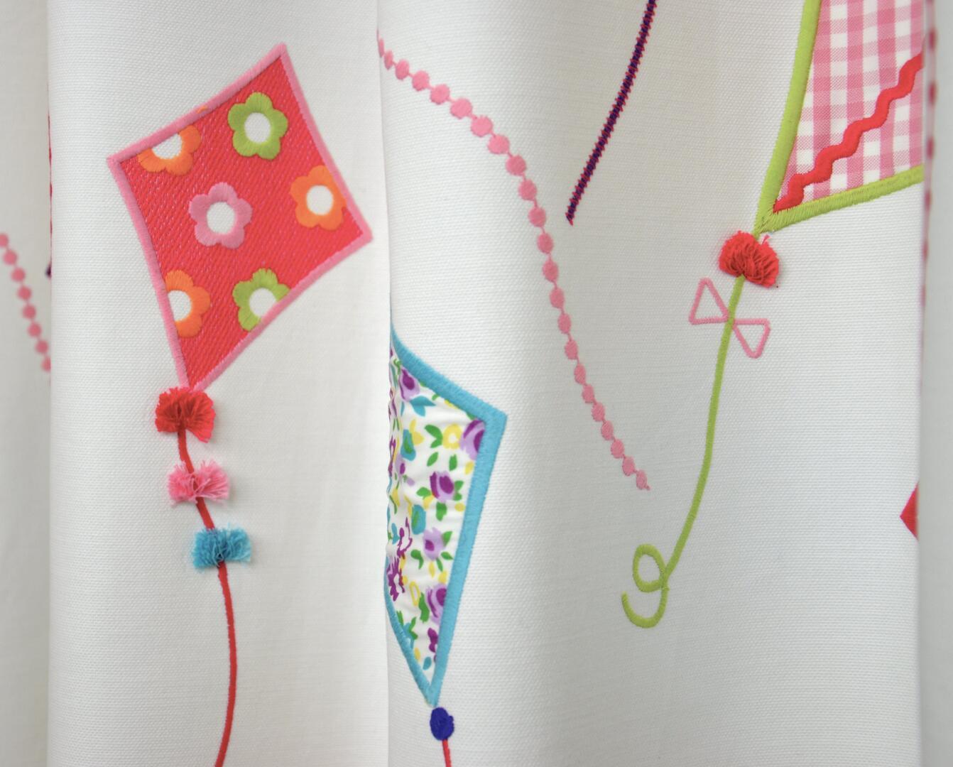 De vliegers zijn niet geprint, maar opgebouwd uit ingenaaide stukjes patroonstof die met een contrasterend stiksel zijn vastgezet. Hierdoor zijn de vormen licht verhoogd en voelbaar, wat het gordijn extra diepte geeft. Rondom elke vlieger loopt een gekleurde borduurlijn in tinten als rood, blauw, groen en roze, waardoor de vormen helder afsteken tegen de lichte achtergrond.