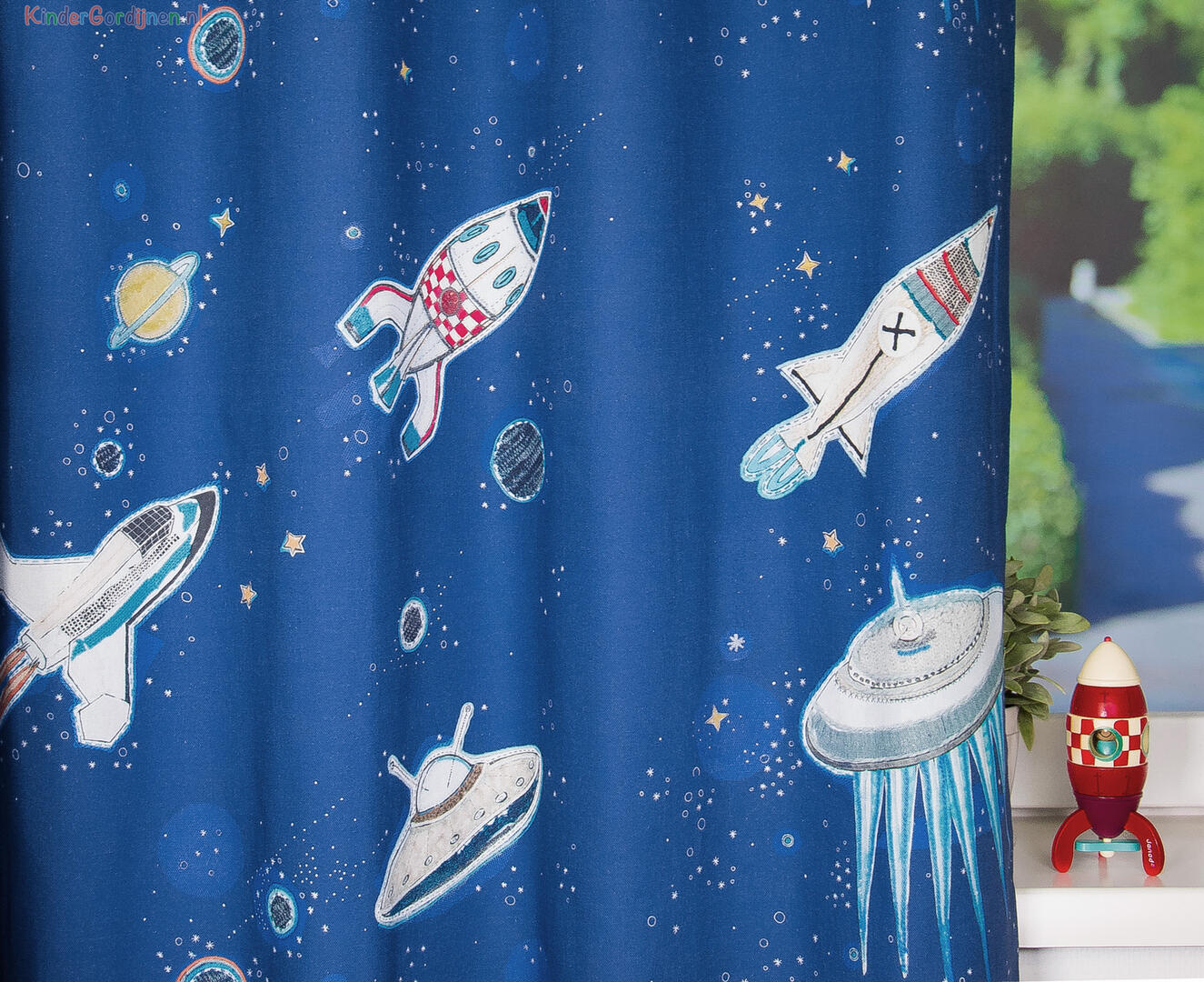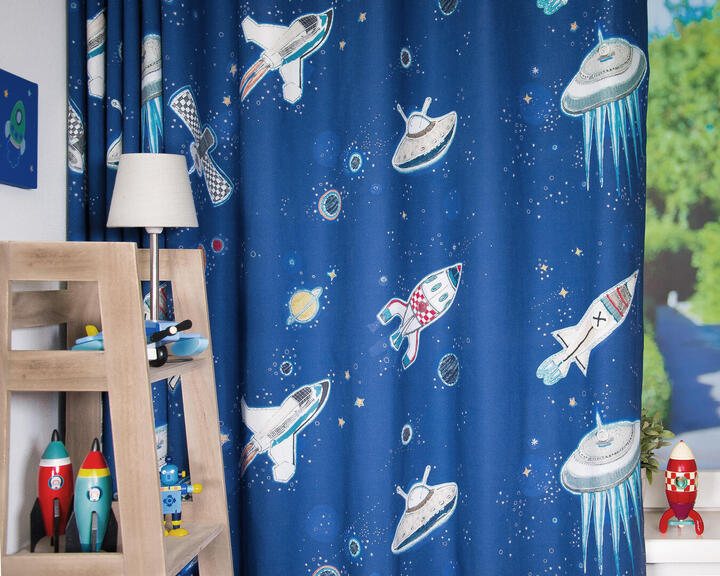 Gek op planeten, sterren, spaceshuttles en raketten? Dit stoere space gordijn is ontworpen door illustrator Hanneke de Jager. Perfect voor astronauten in de dop.