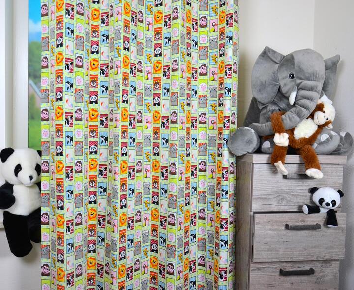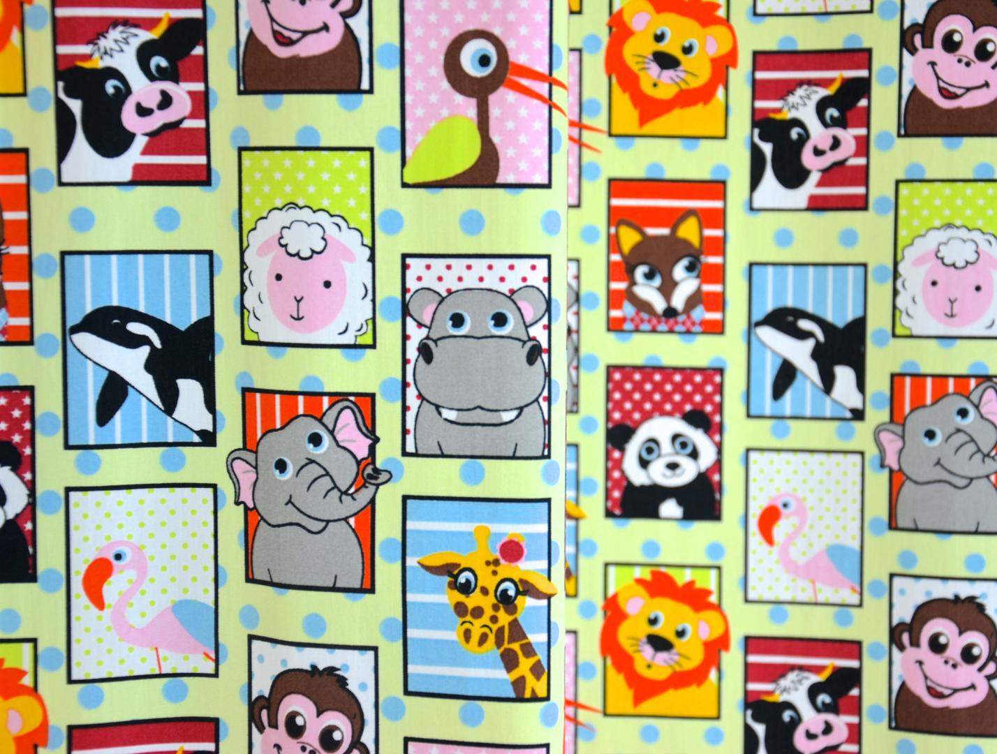 Echt een gordijn voor de dieren liefhebber! Hier zie je niet alleen SAFARI dieren, maar ook een diepzee orka en een onschuldig wit lammetje. Leverbaar in 2 verschillende kleurthema’s. Het ene gordijn heeft een crème wit met zachtblauw gestippelde ondergrond en de andere is lime groen met zachtblauw. Uitstekend geschikt voor de jongens- en meisjeskamer. De blokjes zijn 4 x 6 cm groot en gedrukt op gladde, matte stof. Wat is jouw lievelingsbeest? Desgewenst verduisterend voeren.