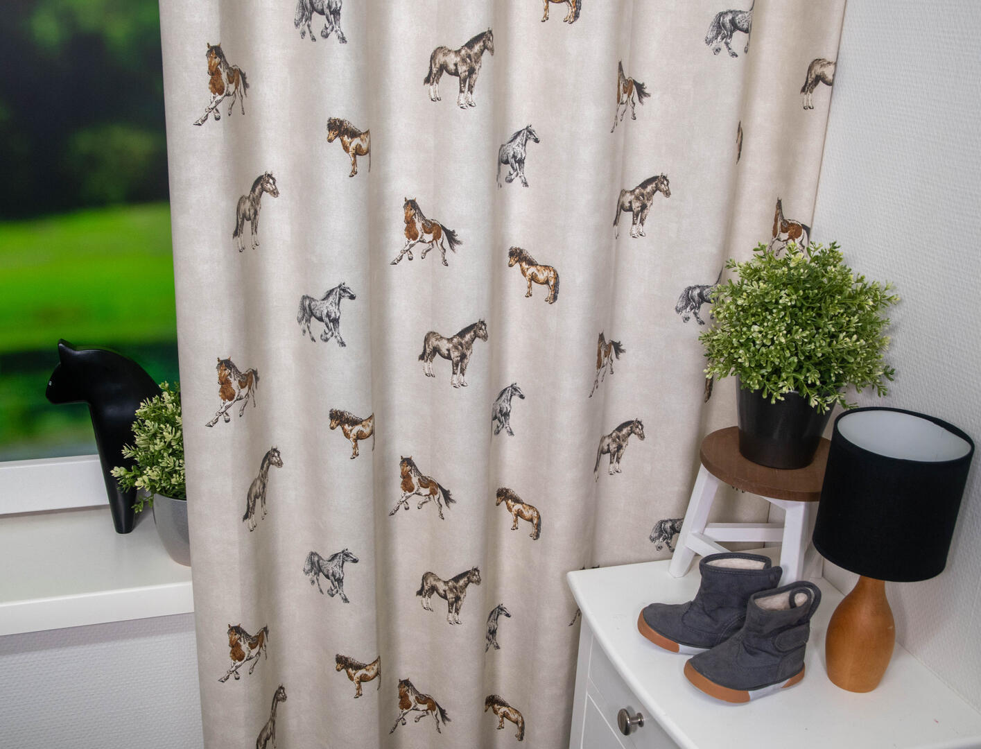 Het paardengordijn Stables! Op de ecru stof pronken verschillende paarden, sommige in galop en anderen in draf. De dikke maar soepele katoenen stof garandeert jarenlang plezier en duurzaamheid.