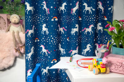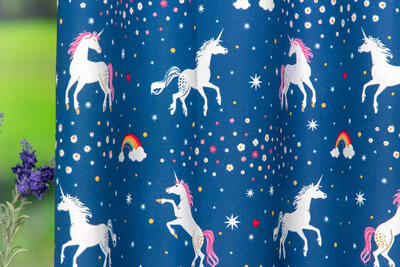 Het Starry Unicorn gordijn zorgt voor een dromerige sfeer in elke meisjeskamer. Met de toevoeging van rode hartjes, gele bloemetjes en lichtgevende sterretjes die oplichten in het donker, is dit gordijn een ware magneet voor de verbeelding van jouw meisje. Een regenboogje hier en daar zorgt voor een extra vleugje fantasie.