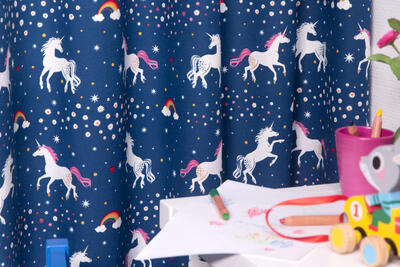 Niet alleen heeft het Starry Unicorn gordijn een betoverende print, maar het is ook gemaakt van dikke katoenen gordijnstof. Dit betekent dat het niet alleen mooi is om naar te kijken, maar ook duurzaam en van hoge kwaliteit is. Het gordijn voelt heerlijk aan en zorgt voor een gezellige en warme sfeer in de kamer.