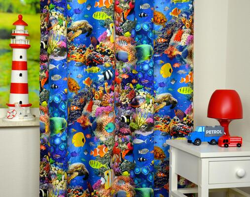 Speciaal zijn de talrijke kindergordijnen met dieren van de zee. Gordijnen met inktvissen, schildpadden of met prachtige pinguïns, walvissen, duikende dolfijnen en natuurlijk vissen groot en klein. Kijk eens naar de verschillende vismotieven, naar gordijnen met golvend koraal of kleurige zeesterren. Om schelpen te zien hoef je niet eens meer naar het strand: in je kamer hangen ze voor je raam. Veel gordijnen met zeedieren hebben een blauwe of witte achtergrond. Voor de babykamer zijn er gordijnen in zachte tinten, bijvoorbeeld met babywalvisjes. De gordijnen met lieflijke zeemeerminnen zijn een extra kijkje waard.