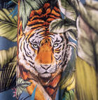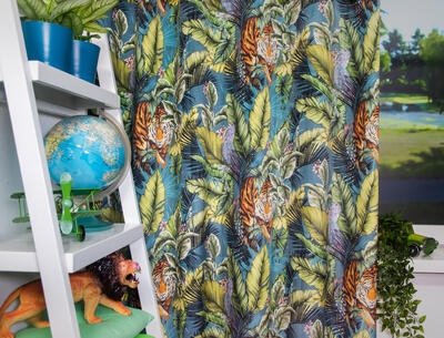 Op deze safari gordijnstof, tussen de wapperende bladeren lopen de fotografisch echte tijgers zo naar je toe.