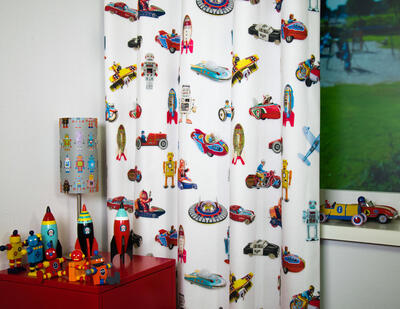 Deze gordijnstof met de naam Tin Toys is gemaakt van de beste materialen waardoor het gordijn mooi in de plooi valt.