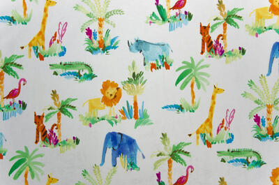 Een TOPPERTJE, dat is dit kindergordijn! Vrolijke dieren zijn afgebeeld op strelend zachte stof. De print is leverbaar in 3 ondergrondkleuren, een warm-wit, lichtblauw en donkerblauw. De safari dieren zijn met een vlotte penseel techniek als het ware geschilderd op de gordijnstof. Dat geeft een speels effect. De flamingo is 8 cm groot, de palmboom zo’n 18 cm. De achterzijde van de stof is egaal gebroken wit. Zie jij dit kindergordijn al voor je? Er is zoveel leuks op te zien en de stof kan desgewenst worden verduisterd met een verduisterende voering.