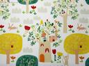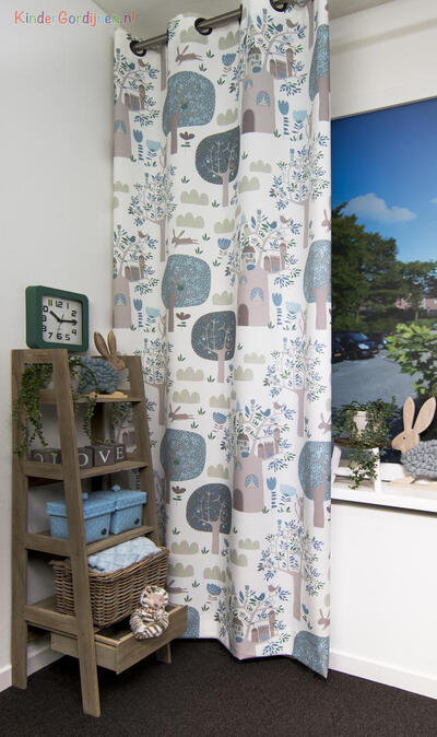 Het gordijn Treehouse brengt een levendige boswereld tot leven waarin elke centimeter iets nieuws laat zien. Tussen hoge bomen met ronde kruinen en sierlijke takken verschijnen kleine huisjes, vogels, konijntjes en nieuwsgierige eekhoorntjes. Het patroon voelt als een fantasierijk dorpje hoog tussen de boomtoppen, waar dieren wonen in boomhutten met raampjes, deurtjes en daken. Overal in het dessin zijn kleine details te vinden: blaadjes, bloemen, wolkjes en dieren die verscholen zitten tussen het groen.