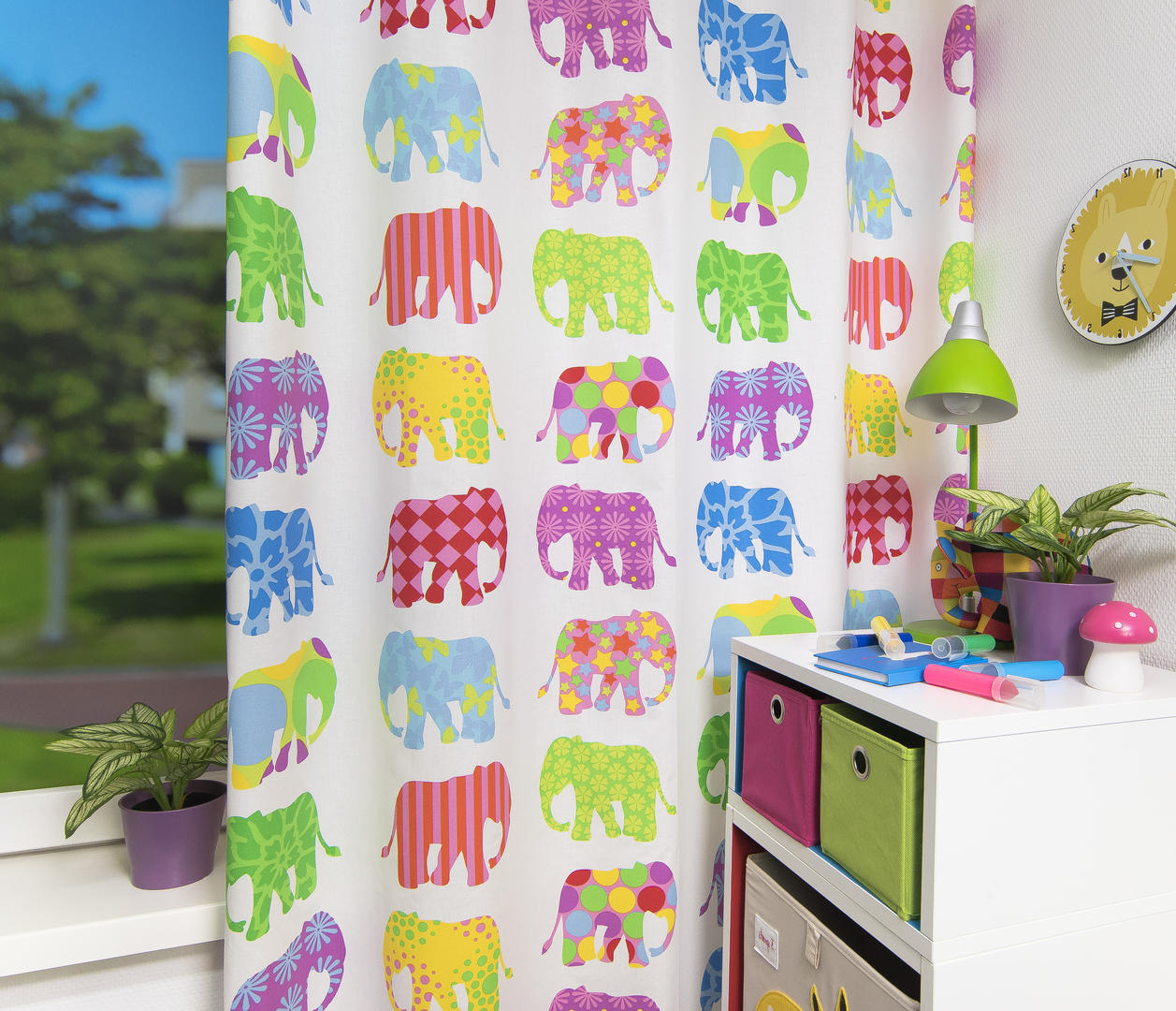 Dit kleurrijke gordijn is gemaakt van 100% katoen. Je kan hem helemaal zelf samenstellen hoe je het gordijn graag wilt hebben.