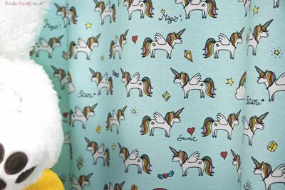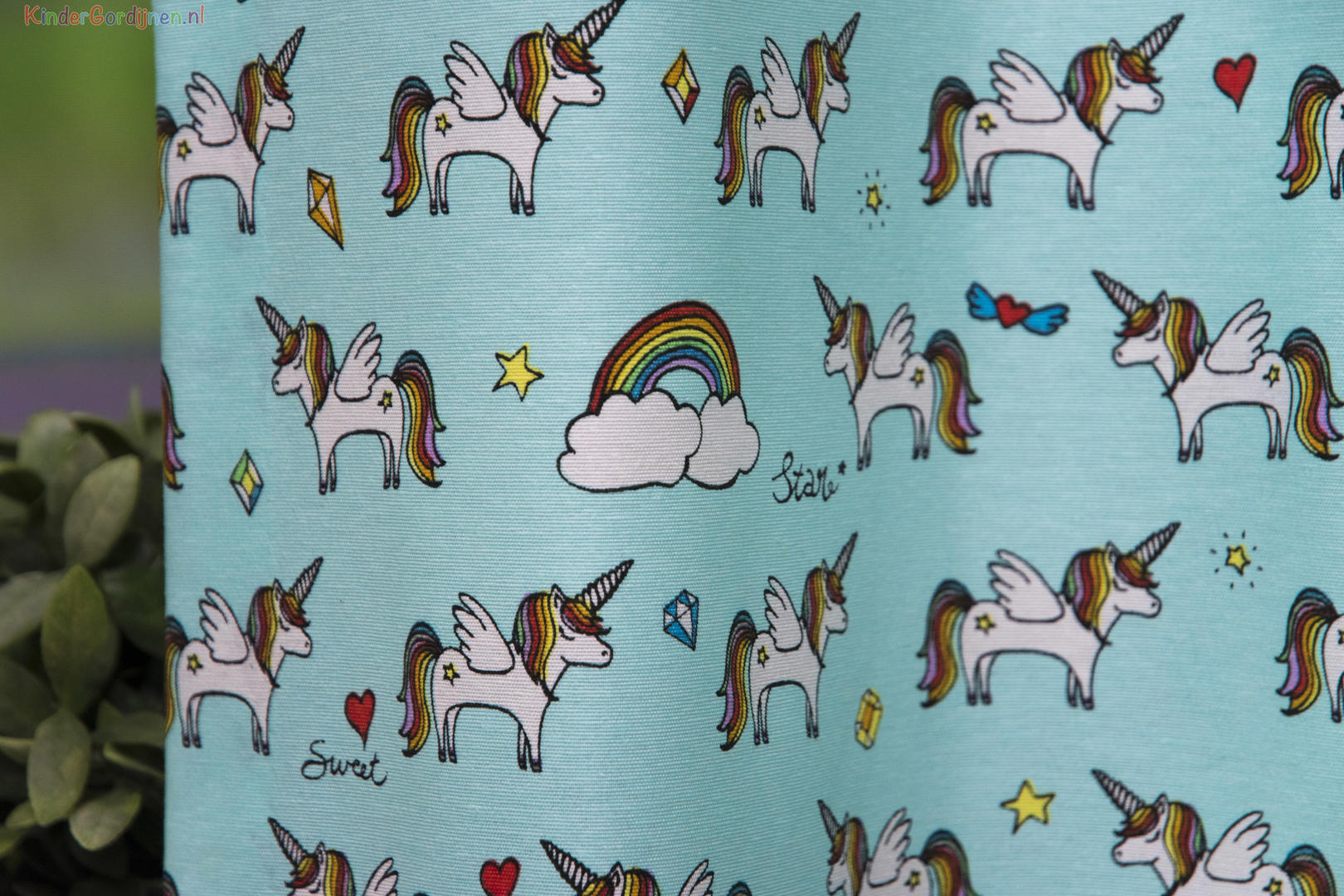 Het Unicorn Starmint is een betoverend kindergordijn voor de kamer van je kind. Dit gordijn, gemaakt van dikke katoenen stof, toont levendige eenhoornpaartjes te midden van sterretjes, edelstenen, smaragden, rode hartjes en wolken, omringd door schitterende regenbogen in bekende kleuren. Een absolute favoriet onder jonge meisjes!