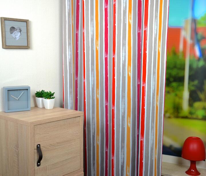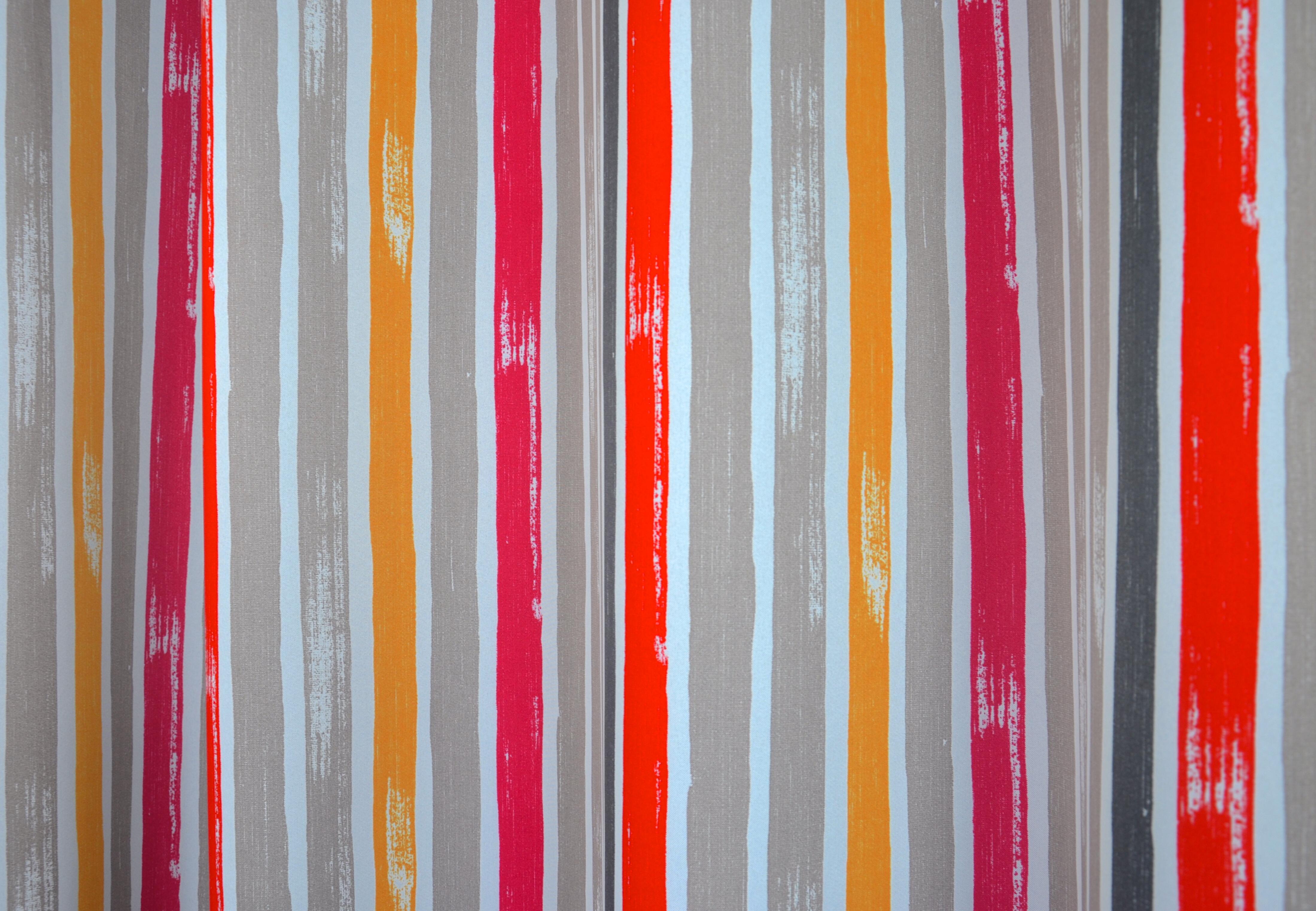 Dit is een hele bijzondere stof! De gordijnstof heeft n.l. twee mooie kanten en JIJ MAG KIEZEN! Welke zijde komt in de slaapkamer? De grote afbeelding laat de ‘Short Strokes ‘ binnen zien. Dat zijn kleurstrepen van 7 cm hoog. De achterzijde is dan gestreept. Wil je die strepen juist binnen (long strokes) dan wordt de stof precies andersom gemaakt. Even de gewenste voorzijde aanklikken. De ondergrondkleur is warm grijs en de stof heeft een behoorlijk donkermakend effect!
