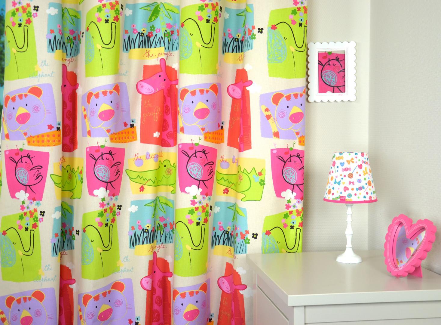 Dieren van over de hele wereld stappen, kruipen en zwemmen de kinderkamer in. Durft uw (klein)kind te slapen in de jungle? Alle dieren op dit kindergordijn zijn afgebeeld in aparte vlakken en felle kleuren.